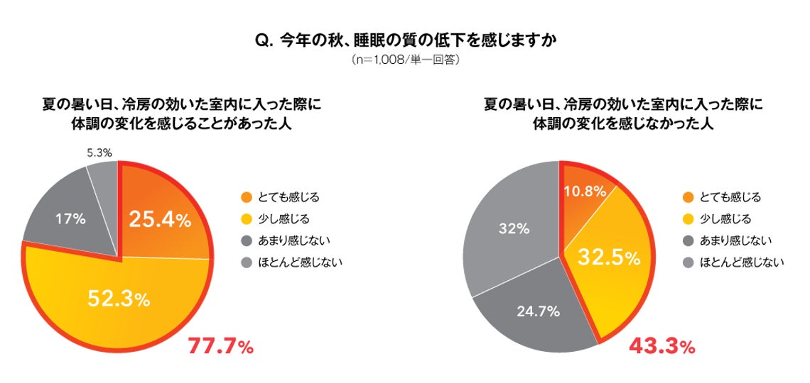 ■夏時期の冷房で体調の変化を感じた人ほど、今秋睡眠の質の低下を実感。