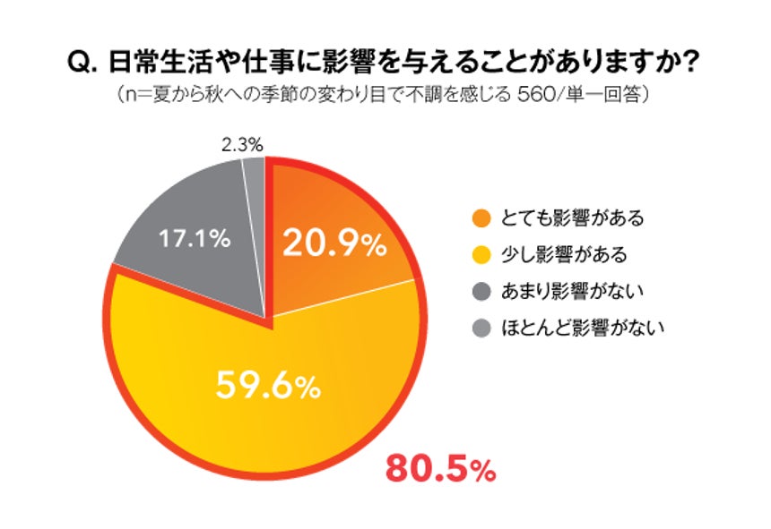・今年、夏から秋への季節の変わり目の不調については、 80.5%が日常生活や仕事に影響を与えることがあると回答。