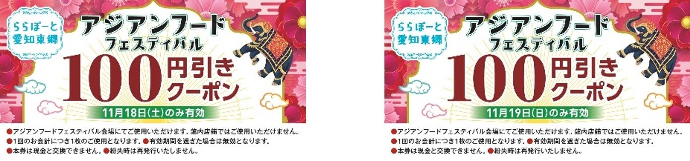 「アジアンフードフェスティバル」では、台湾・タイ・韓国・中国・インドといったアジア各国の大人気グルメを楽しめるキッチンカーなどが、2日間限定で屋外イベントスペース「リーフルーフ」に登場します。イベント期間中は、「アジアンフードフェスティバル」開催当日に使用できるお得な100円引きクーポンをプレゼントいたします。さらに、11月11日(土)~11月26日(日)の期間中は、館内でもお楽しみいただける「アジアングルメ特集」を開催いたします。