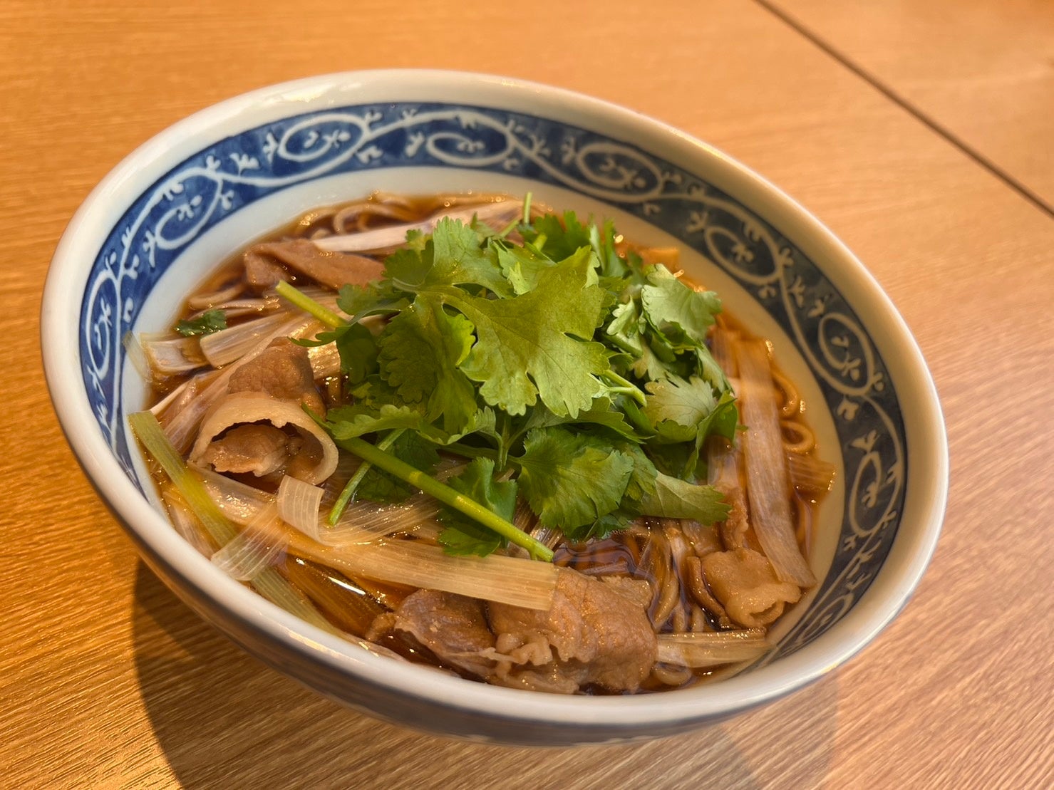パクチーの爽やかな香りが特徴の温かいお蕎麦です!