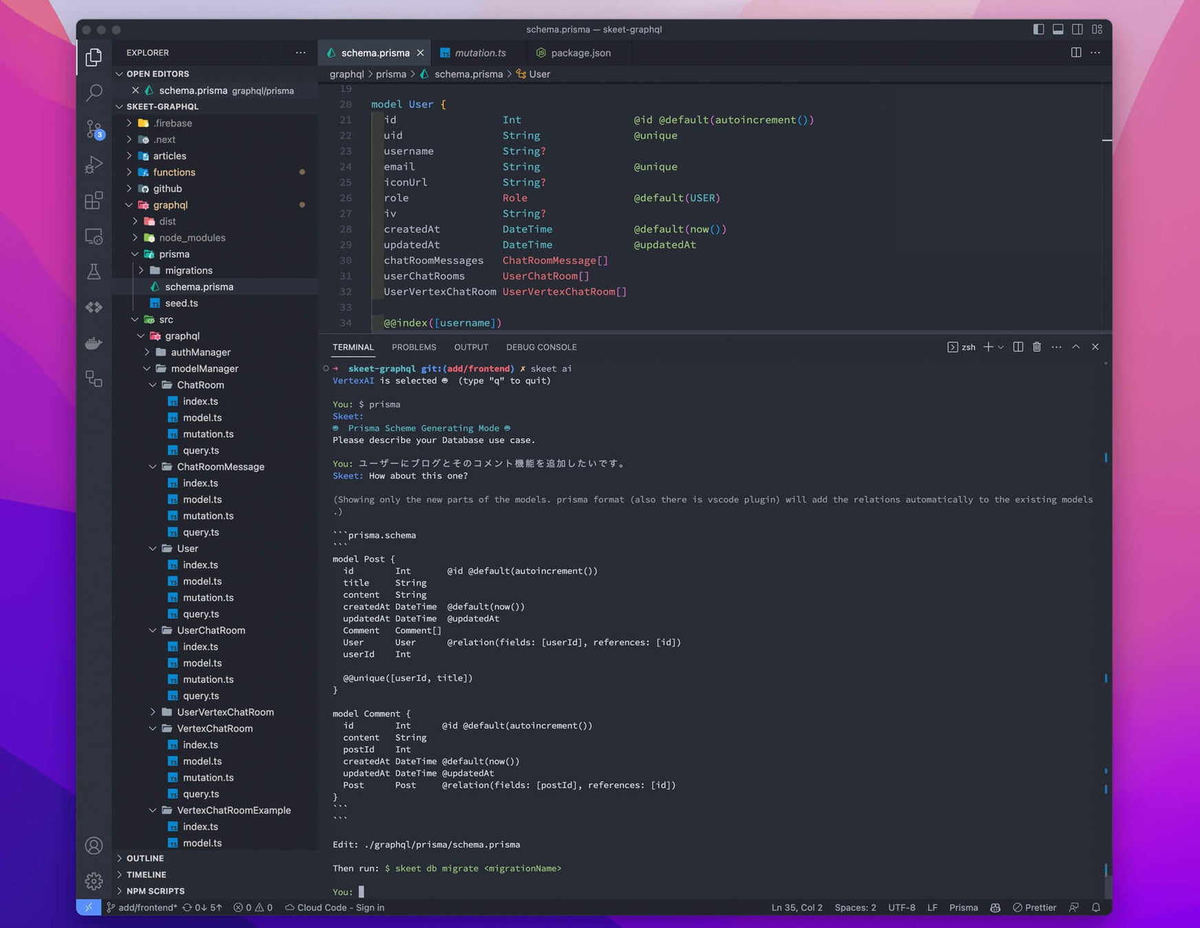 データモデルが用意できれば、Skeet はワン・コマンド(skeet g scaffold)で、そのデータモデルの内容の GraphQL API サーバーに必要なコード(CRUD)を自動生成します。