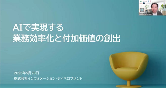 株式会社インフォメーション・ディベロプメント(本社:東京都千代田区、代表取締役社長:宮澤 拓哉 以下、当社)のプリンシパルフェロー 黒住 好忠が、5月28日に在蘭日本商工会議所(以下、「JCC」)と当社オランダ現地法人Information Development Europe B.V.(所在地:オランダ王国 アムステルダム市、代表者:吉田 香織)との共催オンラインセミナー「AIで実現する業務効率化と付加価値の創出」に登壇しました。