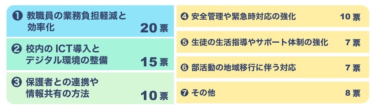 教育現場全体が「生徒の学習環境改善」と「部活動地域移行」を最重要課題と認識しており、これに続く形で「教職員の業務負担軽減」への期待が高まっています。