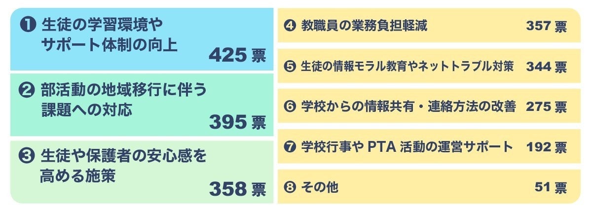 生徒の学習環境やサポート体制の向上: 425票