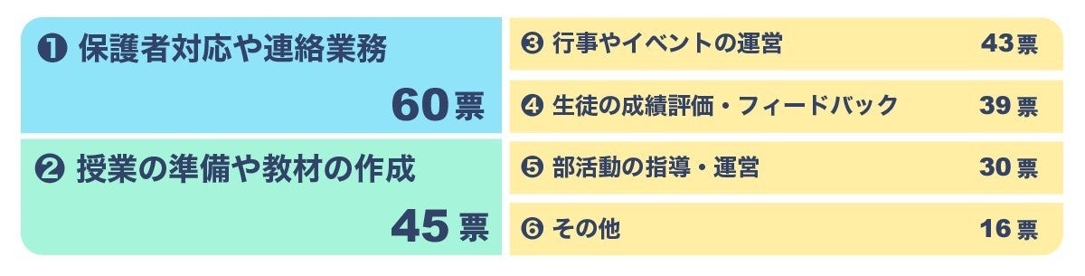 回答者103名の教員から寄せられた声をみるすると、多くの教員が、保護者との連絡業務や事務的作業に追われ、授業準備や指導に割ける時間が限られている現状が浮き彫りになりました。