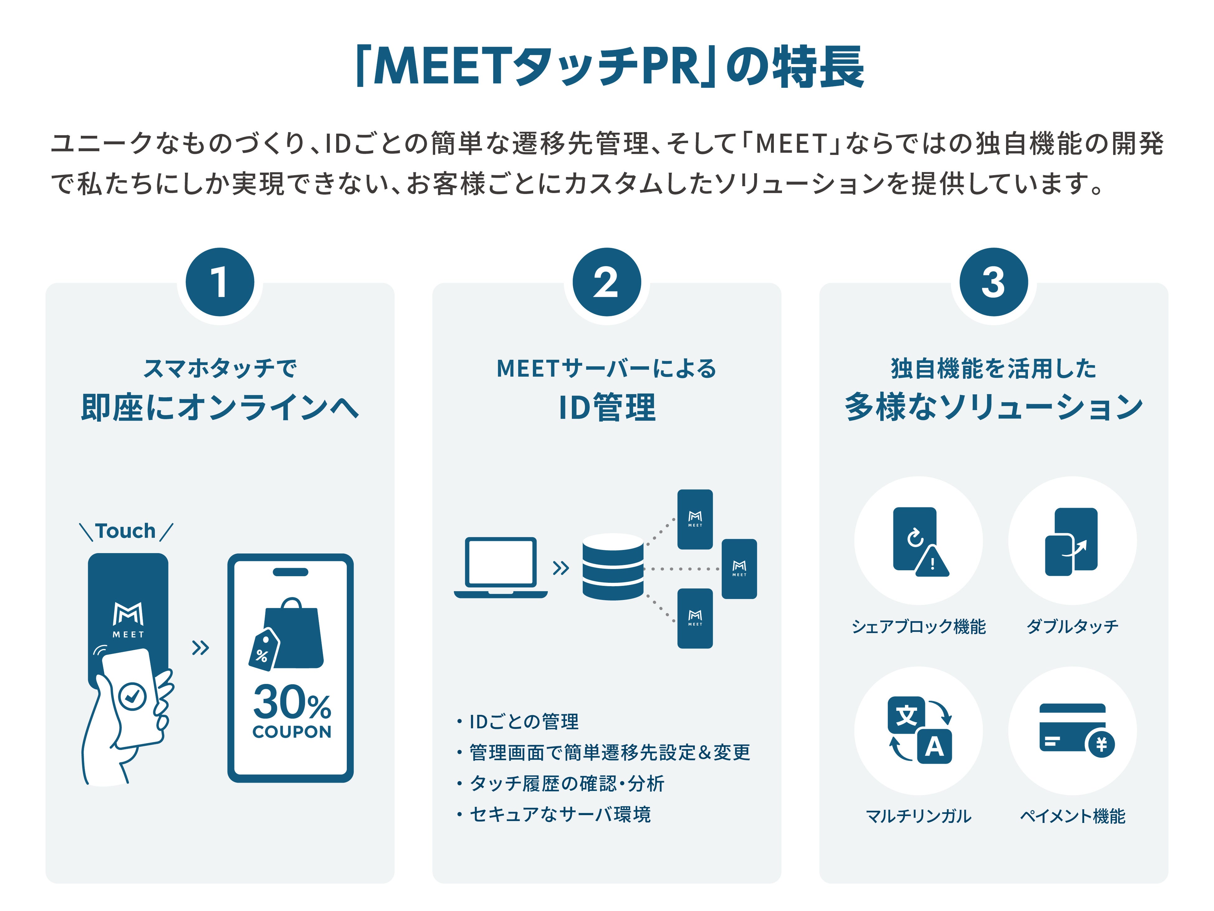 フラッグシップサービスである「MEETタッチPR」は、独自開発のNFCタグ「MEET」と、専用管理画面「MEET SERVER」の構成により、スマホで「MEET」にタッチした際の遷移先URLをリアルタイムで変更可能に。タッチという体験を通じて適切な情報を適切なタイミングで案内する仕組みを実現しました。