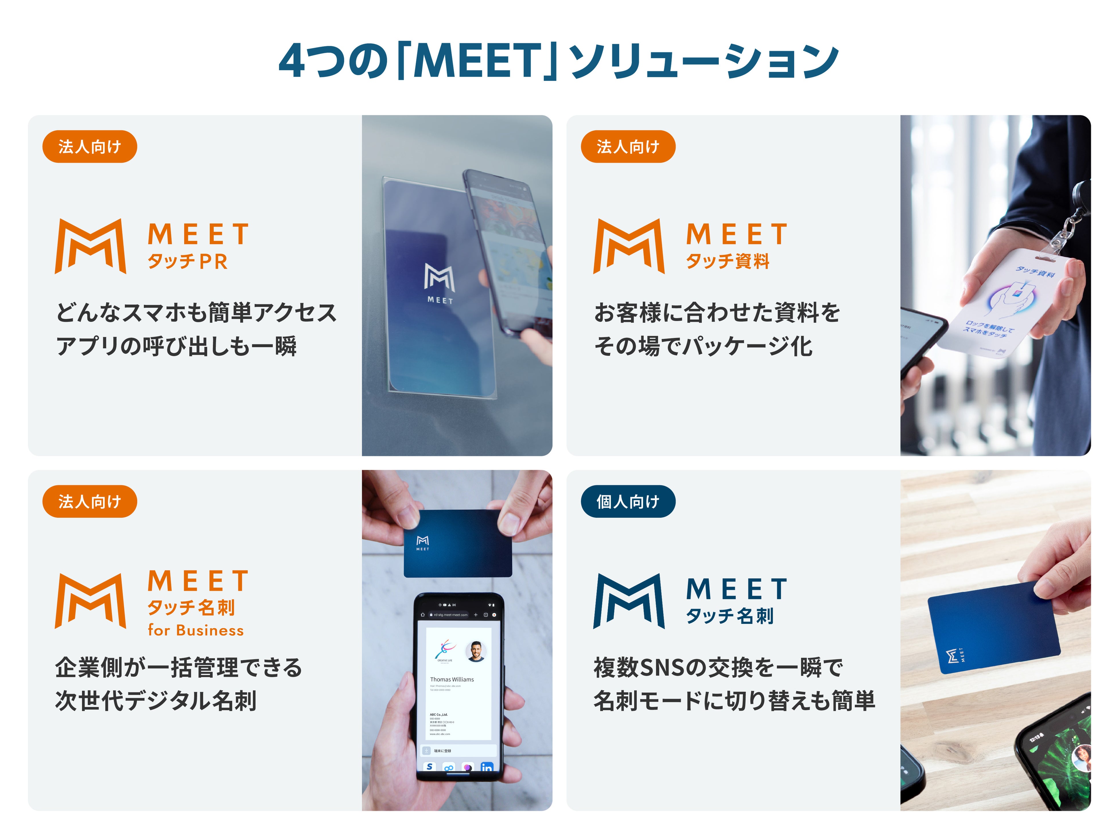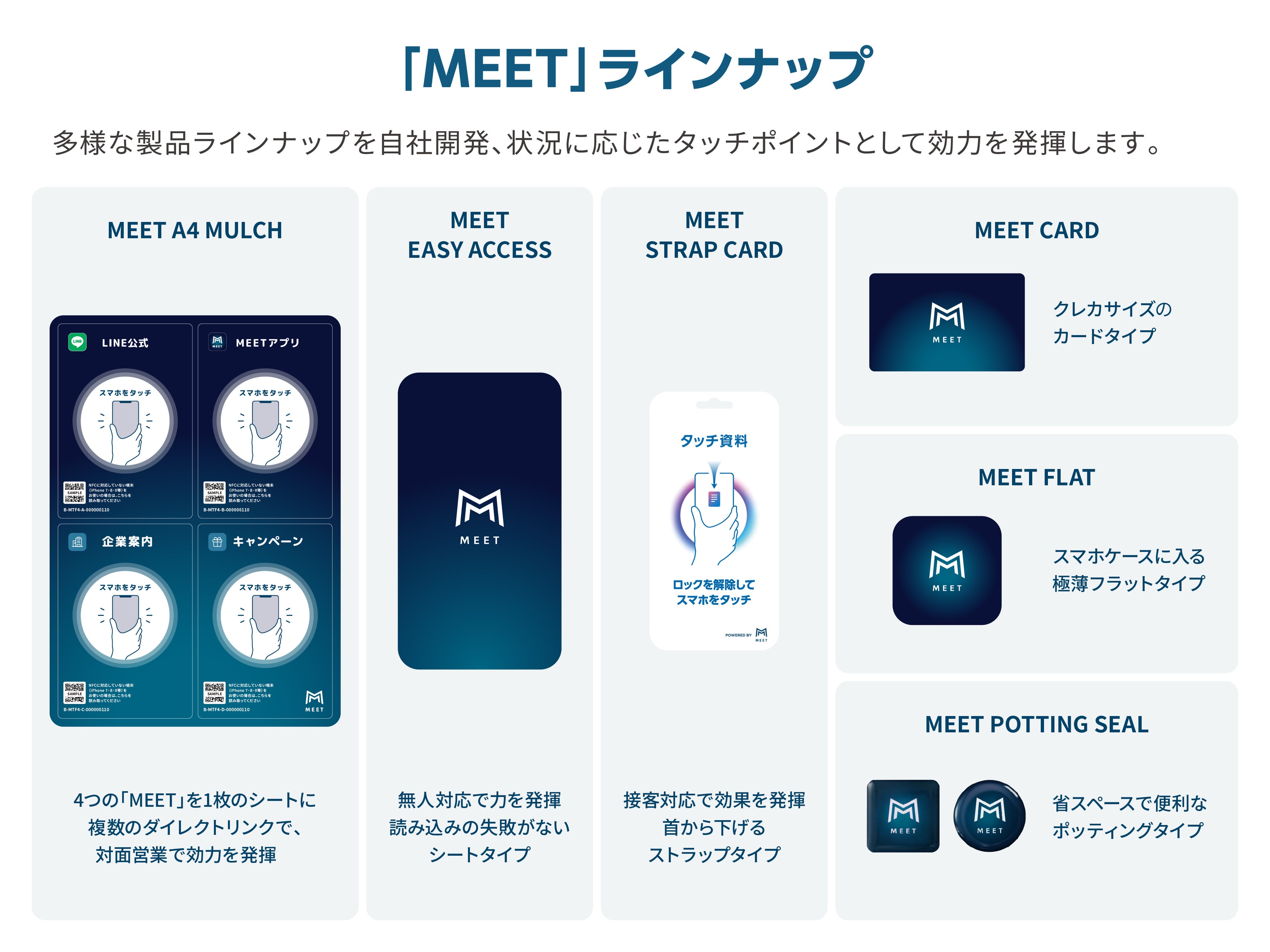 「MEET」は、ミート株式会社が独自開発したNFC(近距離無線通信)を活用したコミュニケーションサービスです。スマホをかざすだけでウェブサイトやアプリなど、あらゆる情報やコンテンツに瞬時にアクセスできます。「MEET」本体は差し替えることなく、管理画面からリアルタイムに表示コンテンツの変更が可能です。「MEET」は、法人向けから個人向けまで幅広く商品をラインナップ。特に「MEETタッチPR」は営業活動のDX化、店舗やイベントでの利用等、多くの企業に様々な用途で活用されています。