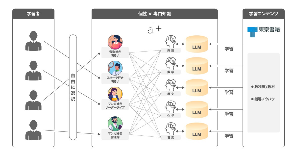 本実証実験は、専門知識と個性を備えた「AI学習アシスタント」の開発を目的としており、教育領域で大規模言語モデル(LLM)を活用する新たな取り組みです。「AI学習アシスタント」は、AIの特性を生かし、学習者一人ひとりに適切なフィードバックやサポートを提供することで、英語や数学などの専門知識の効率的な理解や習得を促すとともに、性格や嗜好などの個性が異なる複数のAIを提供することで、学習者自身が、自分の好きな個性を持ったAIと、親しみを持って継続的に学習できる、個別最適な学習サービスを目指しています。