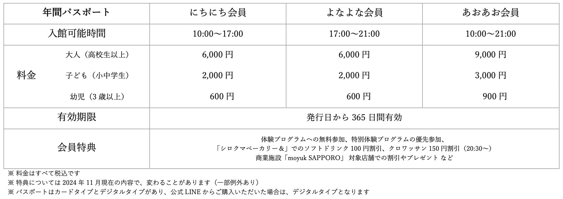 「すいぞくかんクラブ」は、水族館を日常的に楽しんでいただくための会員制度です。生物に関する体験プログラムや、イベントなどの優先参加、「シロクマベーカリー&」の一部メニューの特典のほか、商業施設「moyuk SAPPORO」対象店舗での割引やプレゼントなどが受け取れます。会員になるとAOAO SAPPOROの年間パスポートが発行されます。