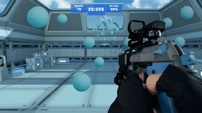 ハンドガンに搭載したスマホとリンクしており上下、左右にハンドガンを向けると連動して画面も移動。画面は奥行き感もあり、小さいスマホ画面でも夢中になるとシューティングレンジの世界が広がります。