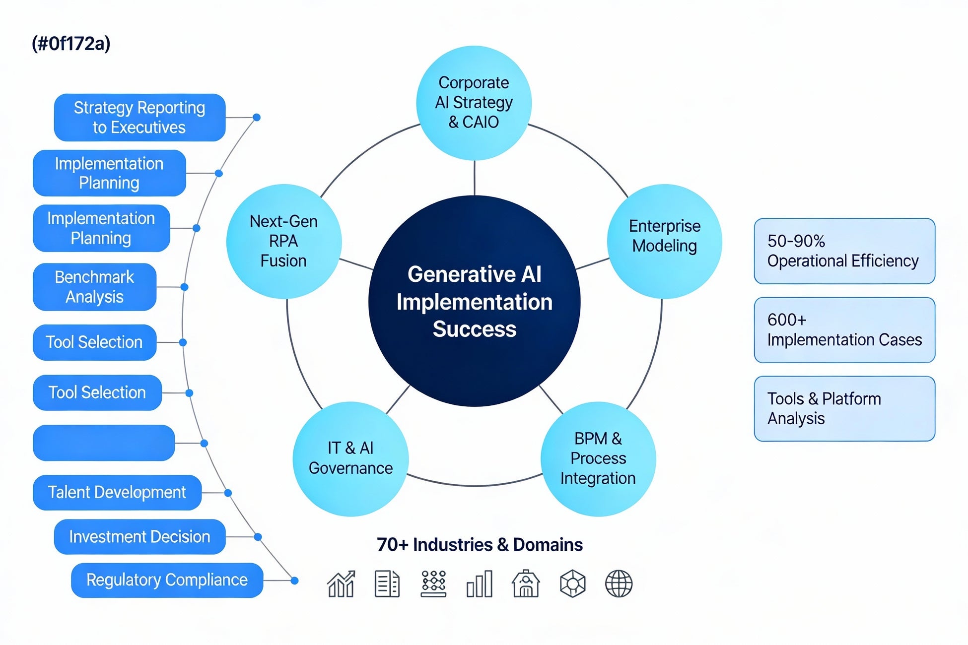 企業AI戦略(CAIO)、エンタープライズモデリング、ビジネスプロセスマネジメント(BPM)、ITガバナンス、次世代RPA、AI検索、IT運用、データ分析、ナレッジマネジメント、プロジェクト管理、リスク管理、予知保全、品質・安全管理から、法務・リーガルテック、貿易、複合業務のAIオーケストレーション、働き方改革、サービスマネジメント、、行政・自治体等々、70を超える業界・領域での実装状況と成果を網羅している。