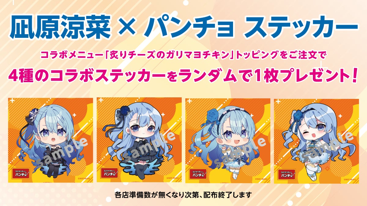 また、販売期間中は対象店舗のポスターやBGMなどを凪原涼菜さんがジャック。パンチョ店内がまるでコンサート会場かのようになるかも?! さらにコラボトッピングをご注文の方には全4種の「凪原涼菜×パンチョ」ステッカーをランダムで1枚プレゼント。コラボ期間限定のレアグッズは各店舗とも準備数が無くなり次第配布終了のため、コンプリートを目指したい方はお早めのご来店をお勧めします。