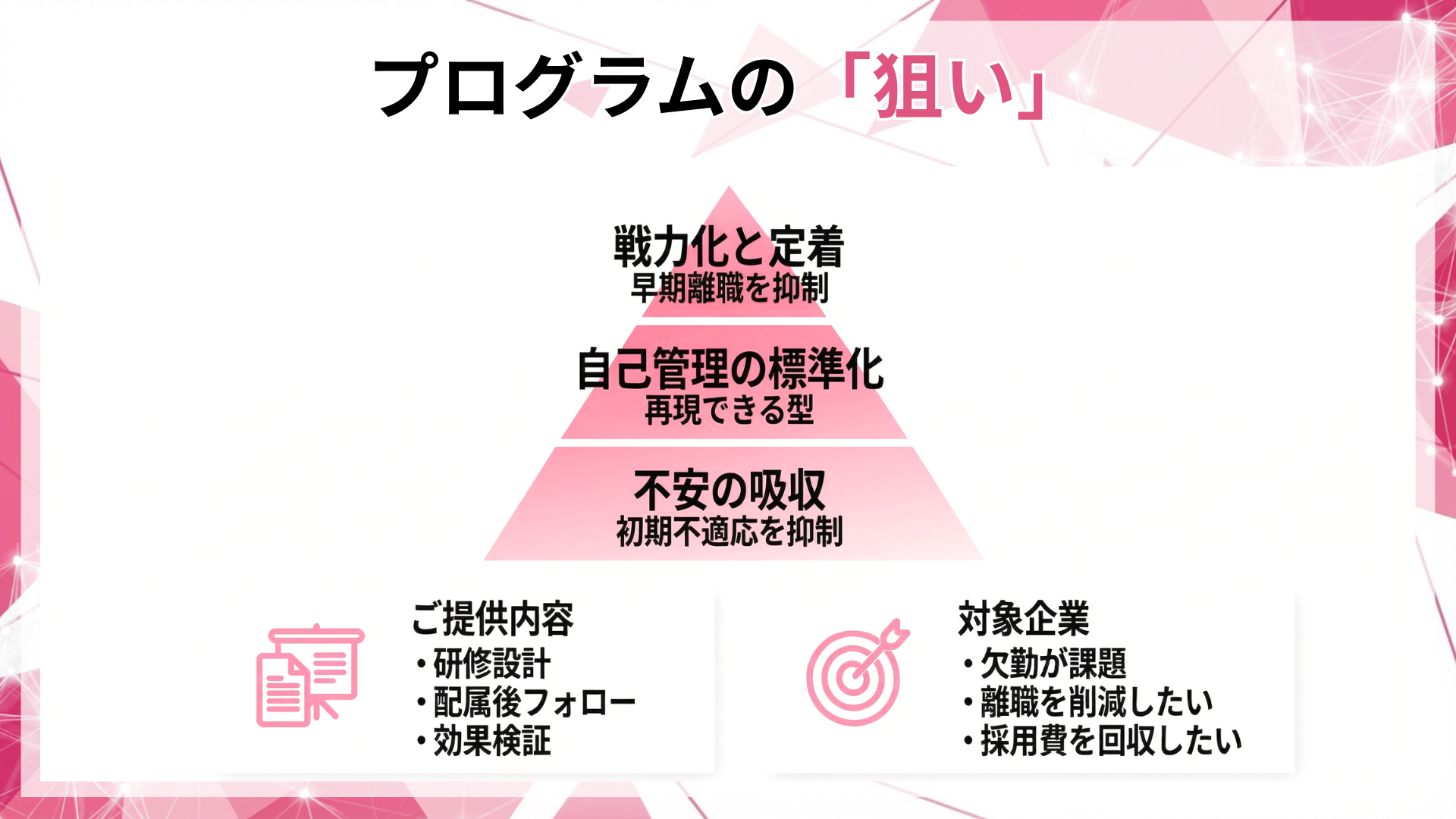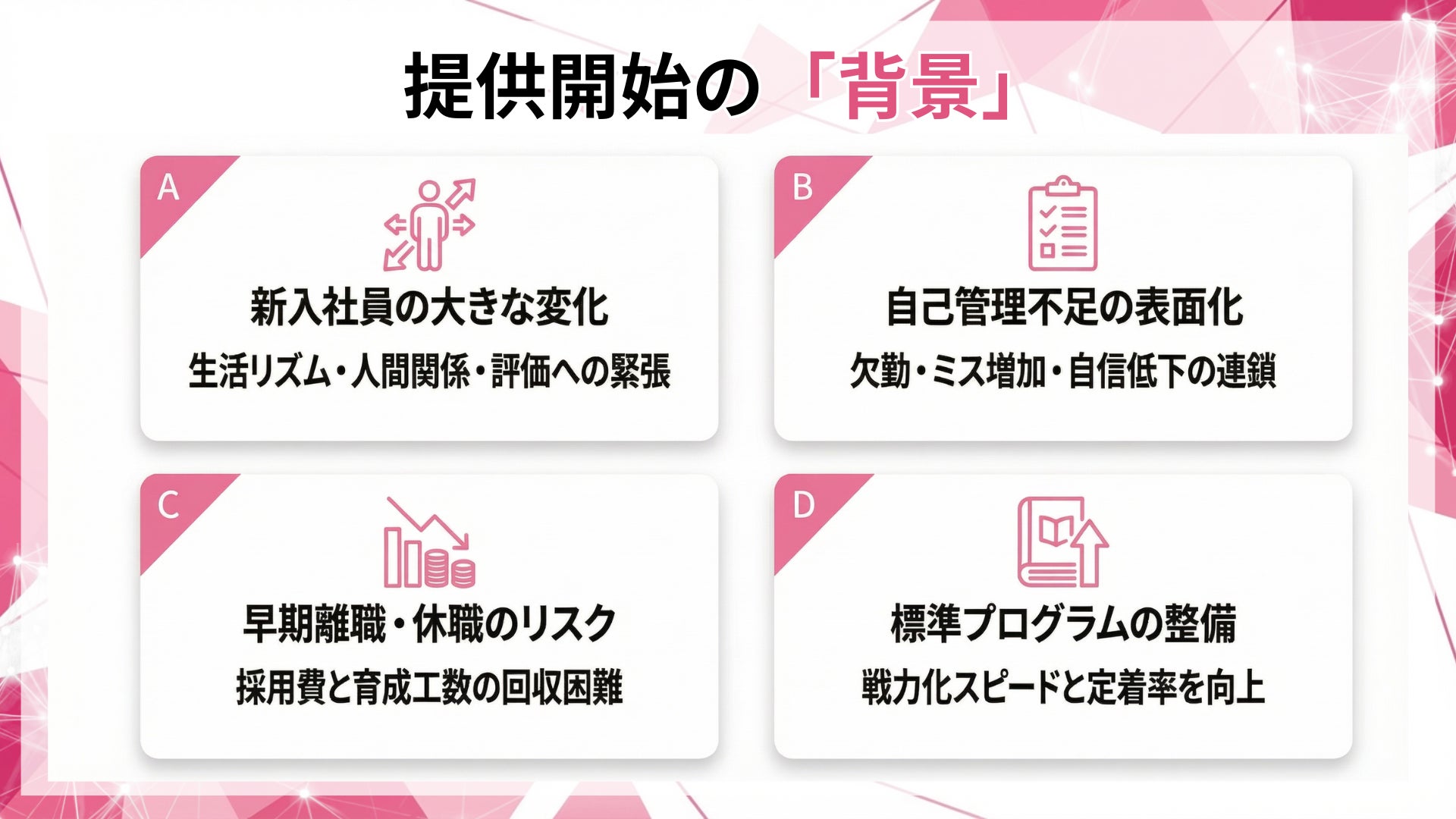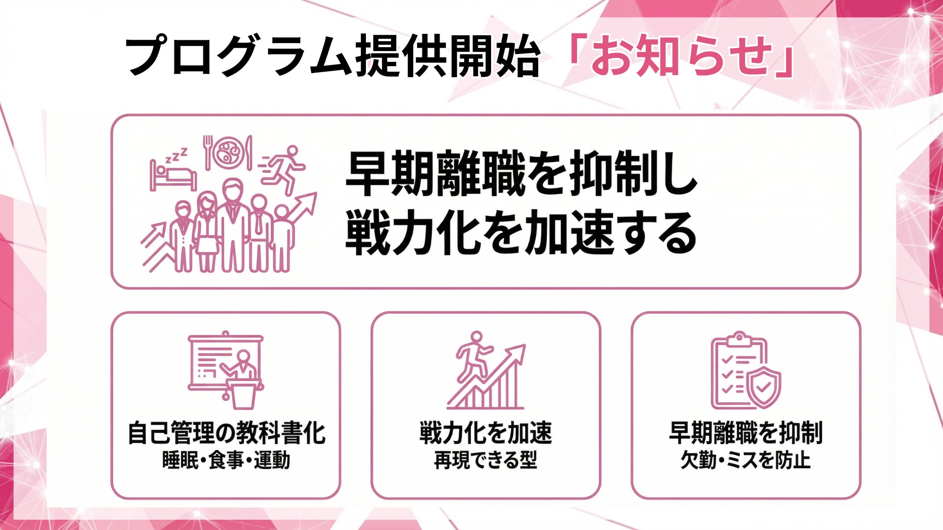 本プログラムは、新入社員の不安と生活課題を早期に吸収し、自己管理を仕事の基本動作として標準化することで、戦力化の立ち上がりを早め、早期離職・休職の損失を抑える研修です。