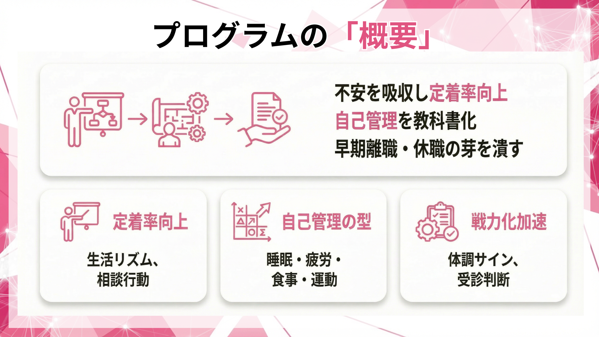 本プログラムは、健康経営を理念として語る研修ではなく、仕事の基本動作としての自己管理(睡眠・疲労・食事・運動・休み方・相談行動・受診判断)を教科書化し、配属後に再現できる型として定着させることを目的とします。