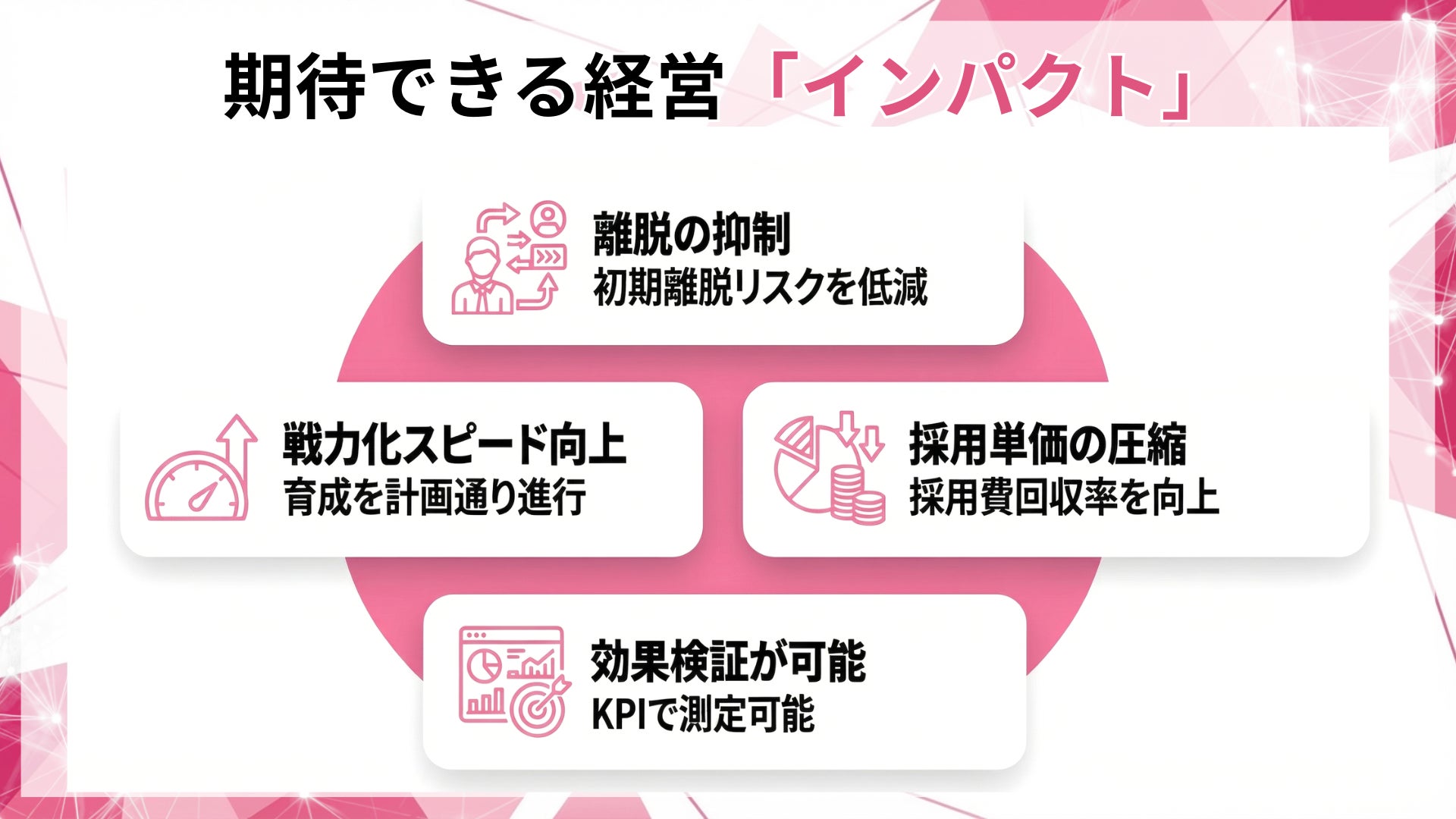欠勤・遅刻早退・オンボ完了率・定着率で効果を検証し、次年度の新入社員研修へ反映