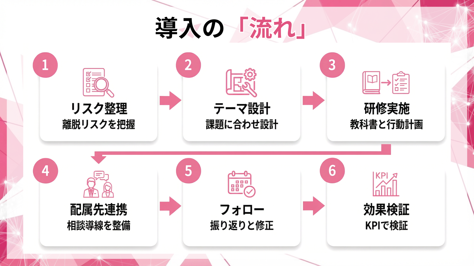知識提供で終わらせず、配属後に再現できる行動の型と、上司・人事の受け皿までをセットで整備します。