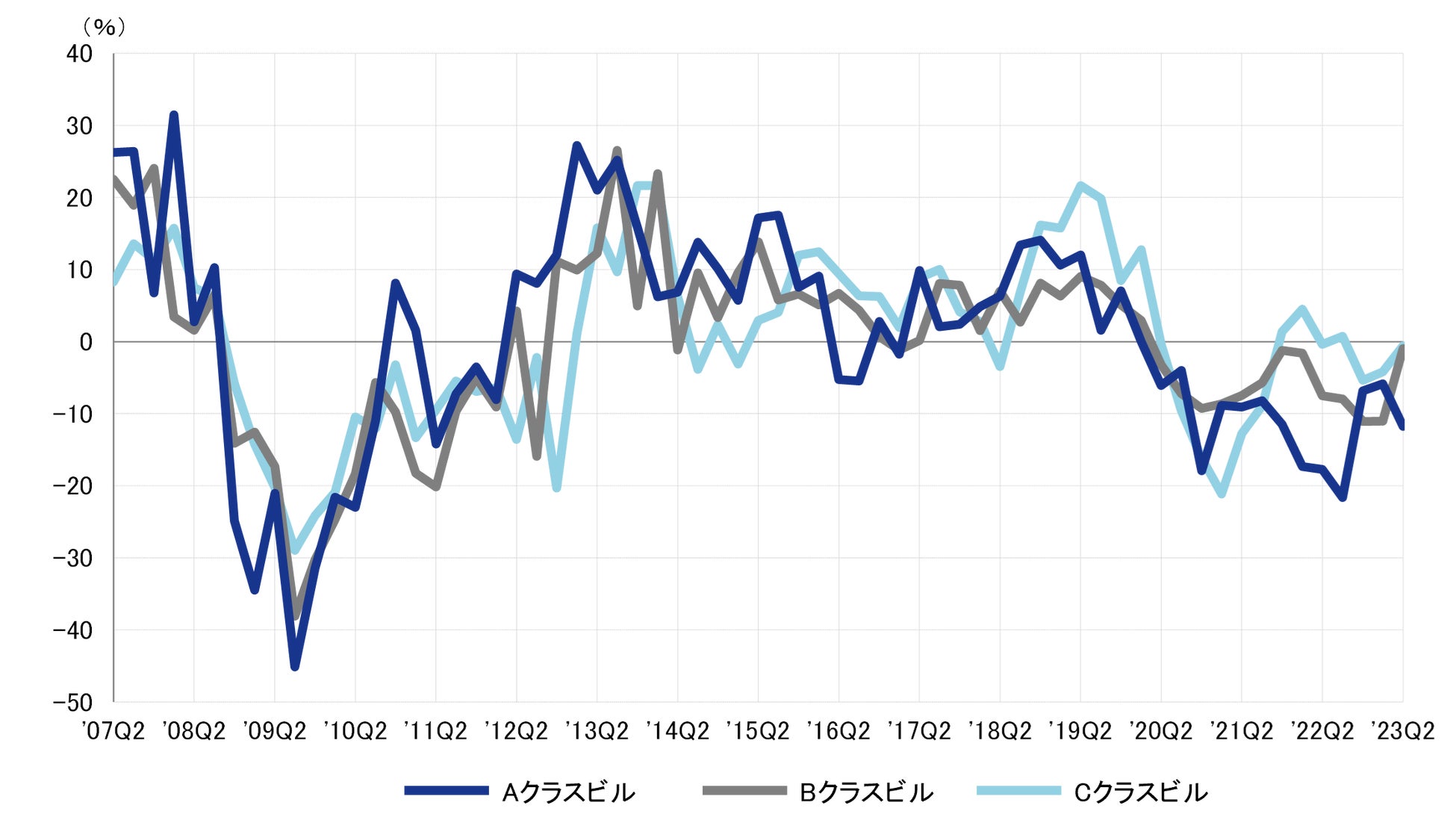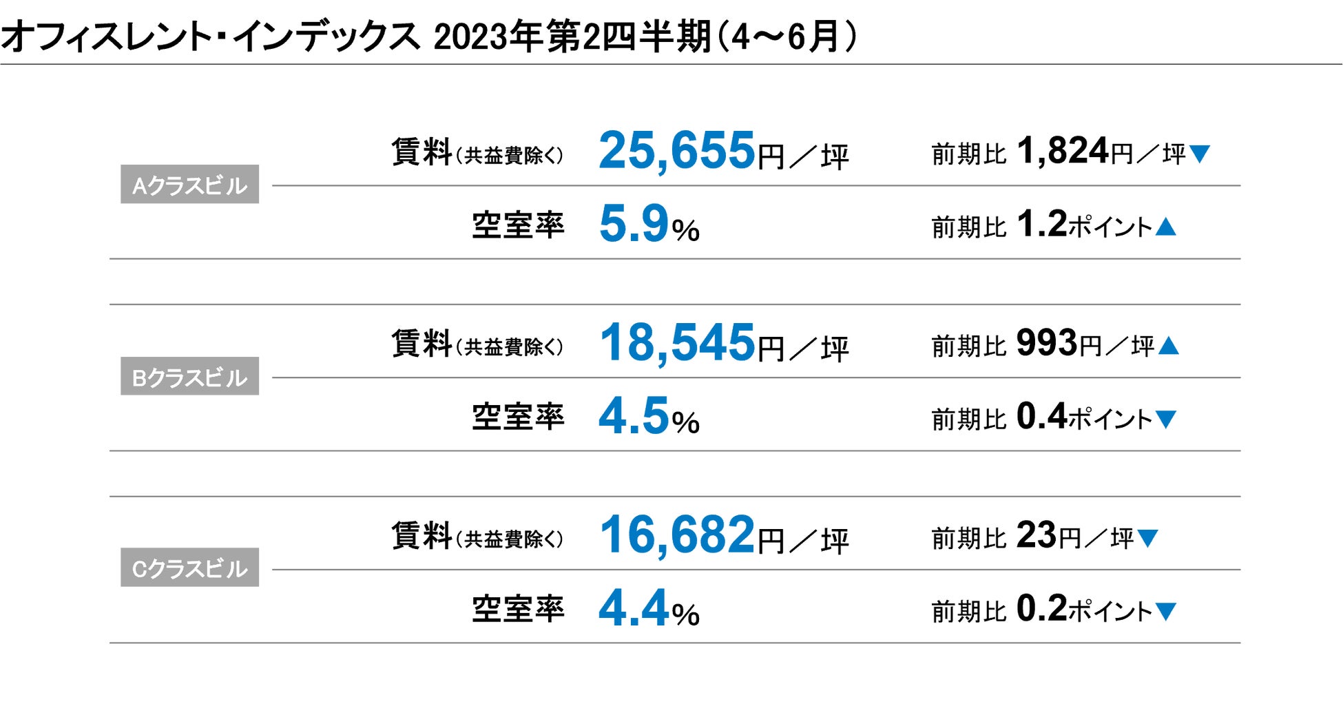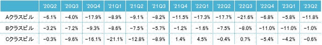 2022年第2四半期との比較による対前年変動率は、Aクラスビルがマイナス11.8%、Bクラスビルがマイナス1.0%、Cクラスビルがマイナス0.6%だった。A・Bクラスビルは13期連続、Cクラスビルも3期連続のマイナスとなった。3期連続して全てのクラスで対前年同期比マイナスとなったものの、BクラスビルとCクラスビルはマイナス幅が縮小しており、今後は対前年変動率がプラスに転じる可能性もある。