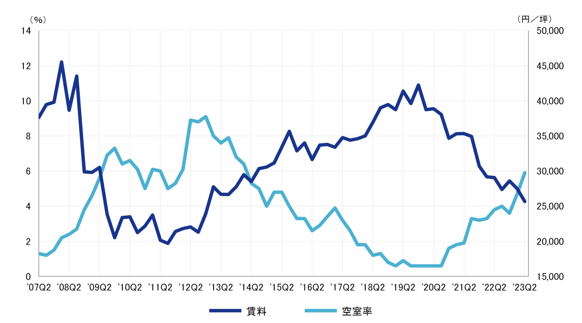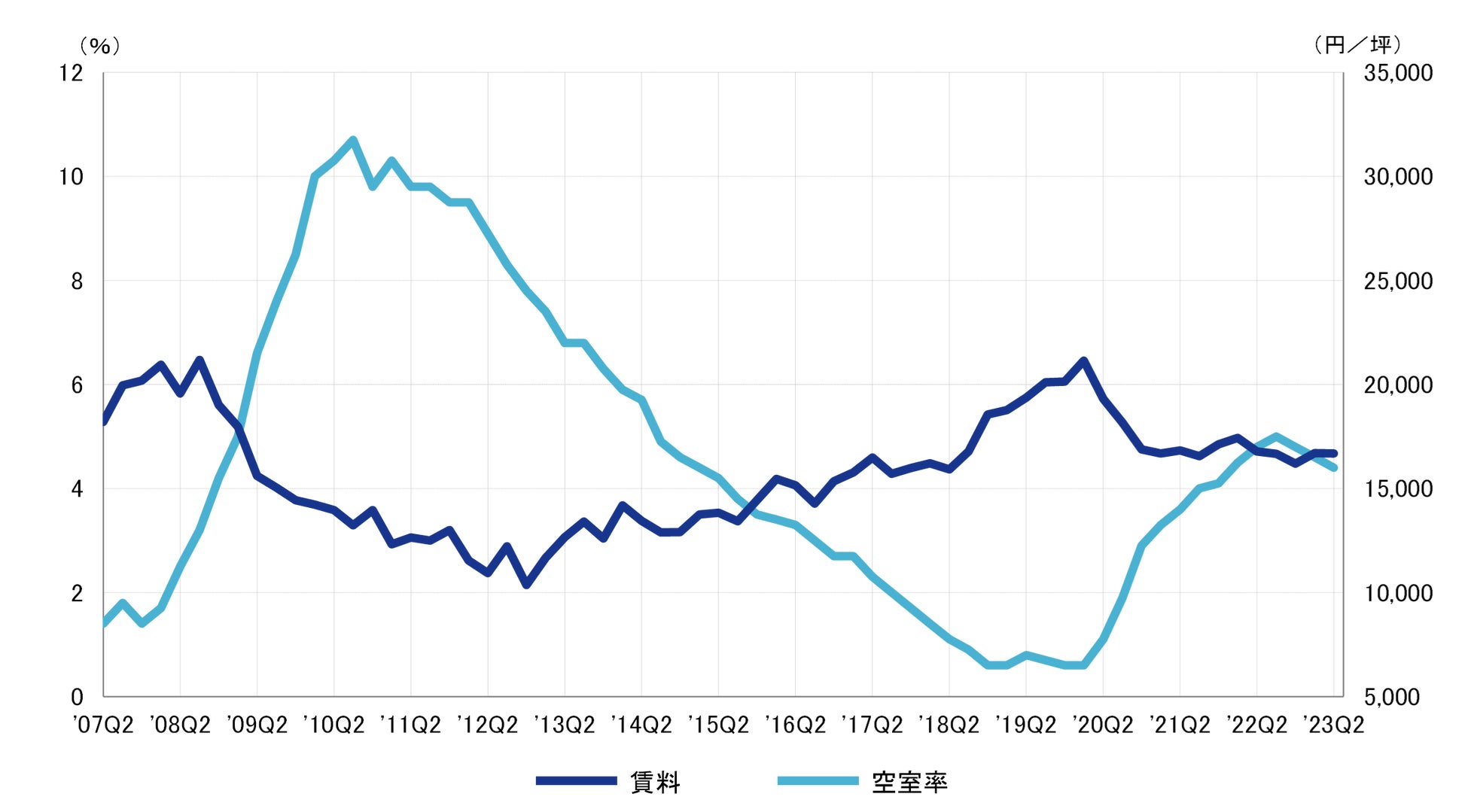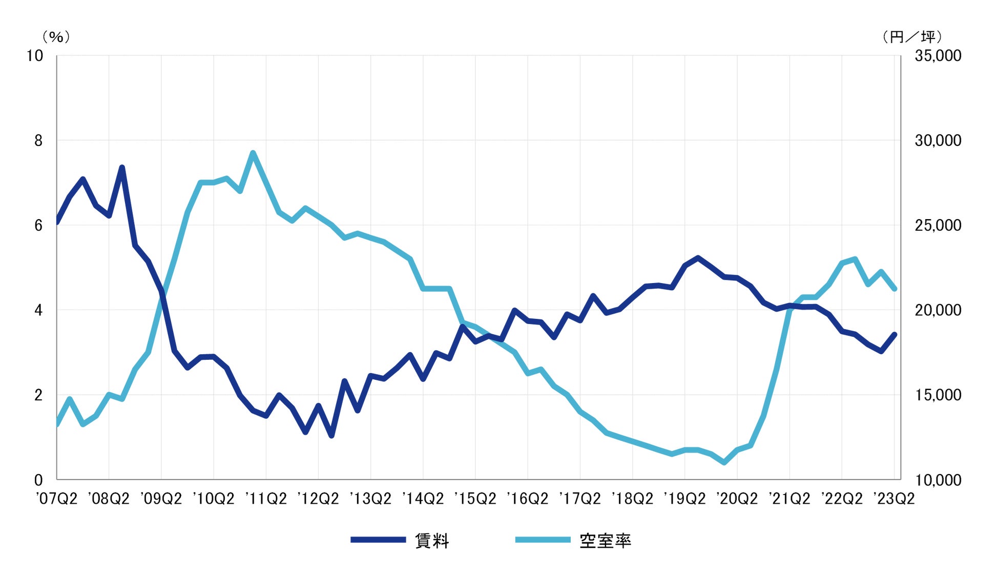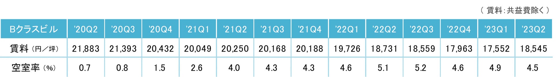 2023年第2四半期のBクラスビル賃料は前期比プラス993円/坪の18,545円/坪(共益費除く)となり、6期ぶりで上昇した。賃料は2019年第3四半期を直近のピークとした低下傾向にあるが、今後の動向が注目される。