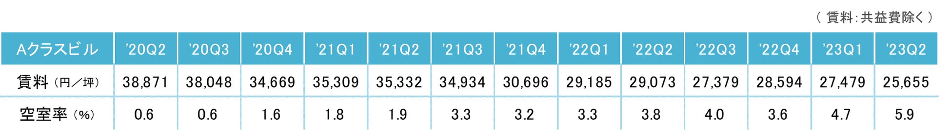 2023年第2四半期のAクラスビル賃料(成約賃料ベース)は前期比マイナス1,824円/坪の25,655円/坪(共益費除く)となった。2期連続の下落となり、賃料は引き続き低下傾向にある。
