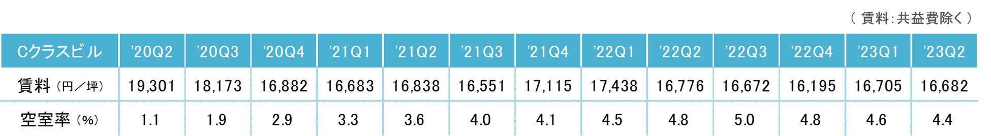 2023年第2四半期のCクラスビル賃料は前期比マイナス23円/坪の16,682円/坪(共益費除く)となった。再び下落したもののわずかな動きに止まり、賃料は2020年第4四半期以降、横ばい傾向が継続している。