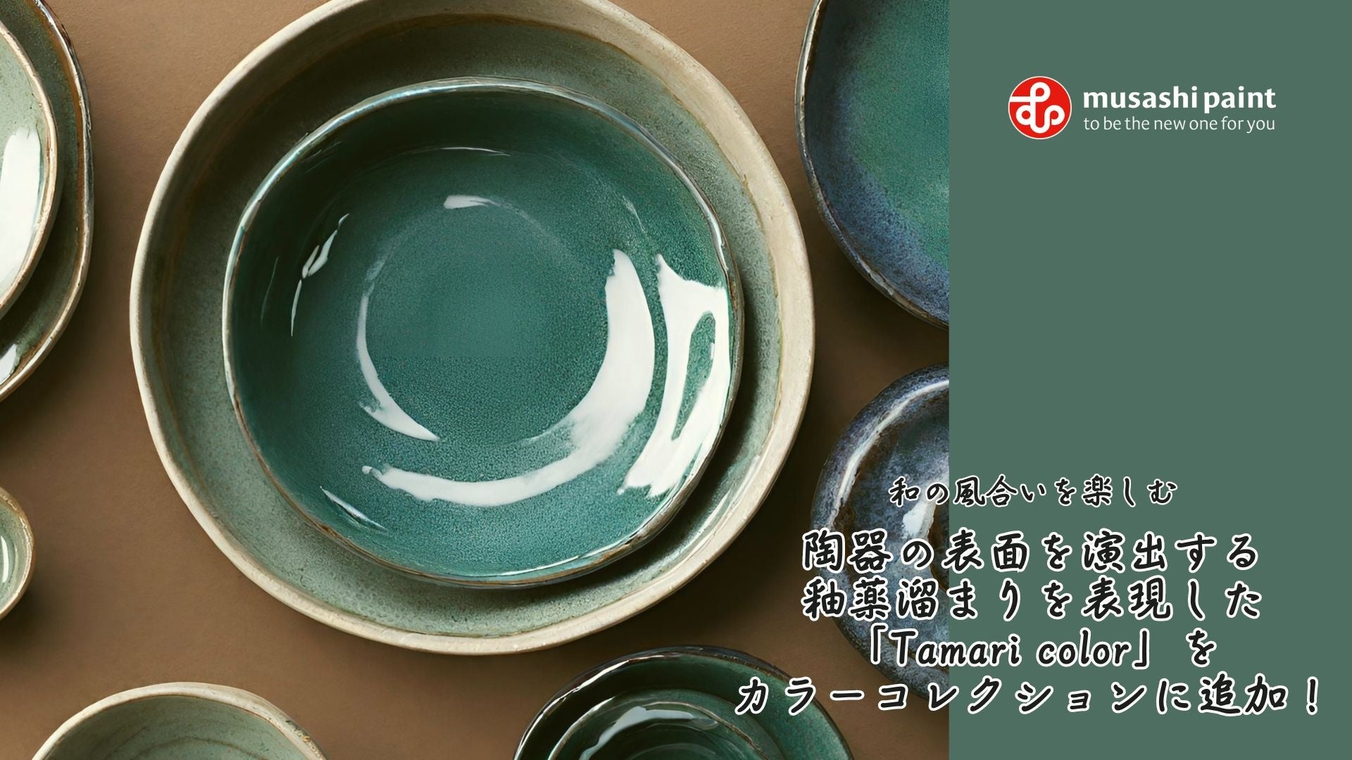 【東京都豊島区、4月】- 武蔵塗料株式会社(本社:東京都豊島区、代表取締役社長:福井裕美子)は、世界中で人気の高い和テイストを追求し、その効果に注目しました。日本の美の象徴である陶器に見られる釉薬の溜まりを再現することで、独特の雰囲気や風合いを演出することができる「Tamari color」を、武蔵塗料のカラーコレクションに加えることを、正式に発表いたします。