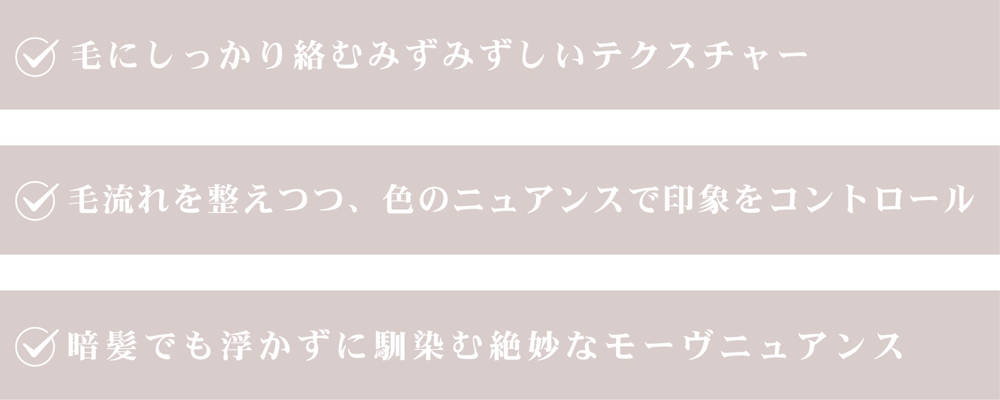 みずみずしいテクスチャーが毛1本1本に絡み、自然な毛流れを整えながら色そのものがまなざしを静かに引き締めます。