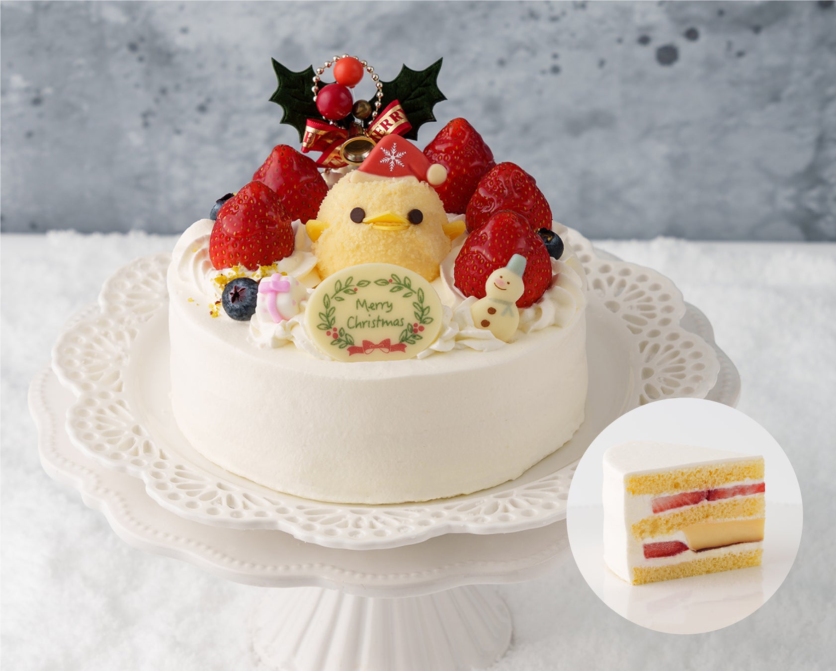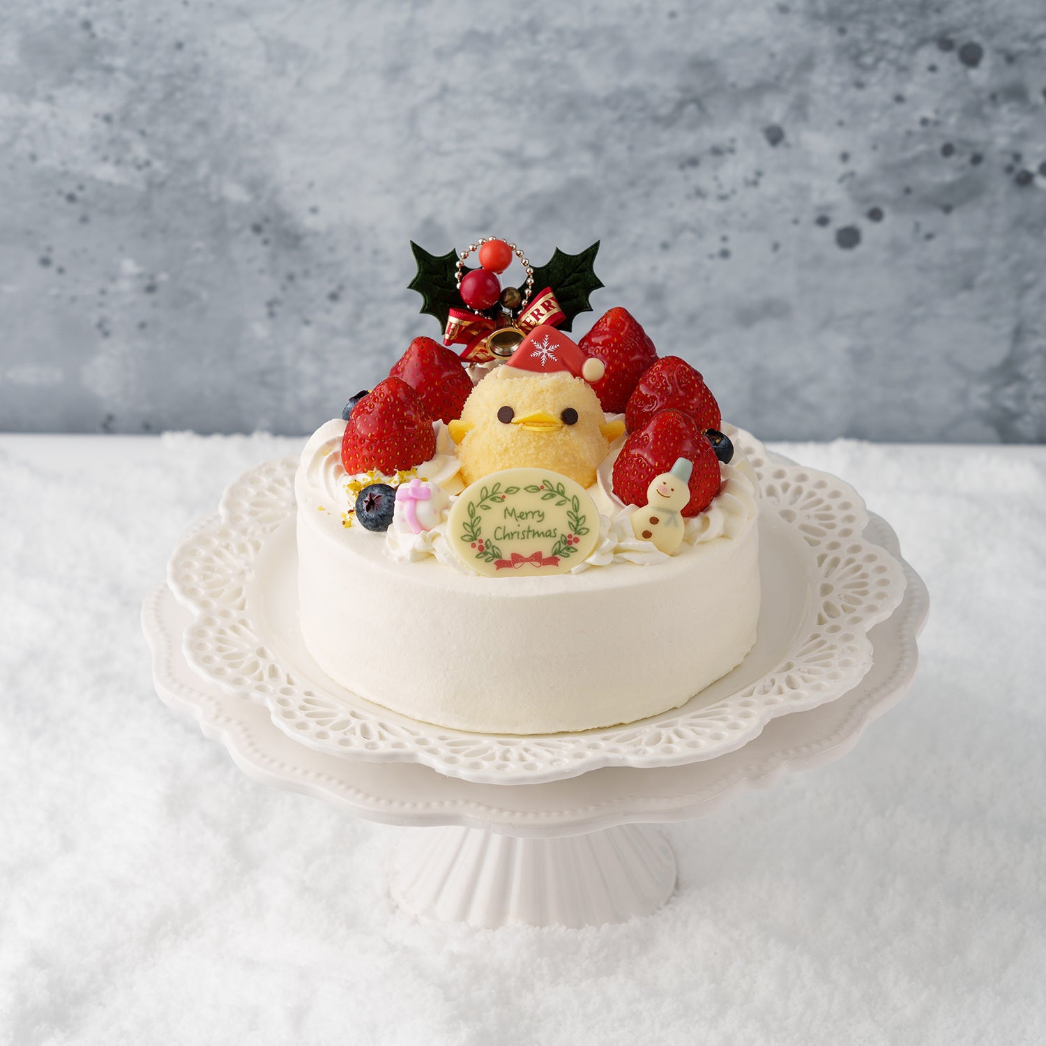 毎年人気の定番クリスマスケーキがリニューアル!しっとり焼き上げたスポンジには、たっぷりの国産イチゴと名古屋コーチン卵の「ぴよりんプリン」がサンドされています。生クリームとの相性も抜群で、サンタ帽をかぶったぴよりんが可愛らしくデコレーションされ、楽しいクリスマスの雰囲気を演出します。