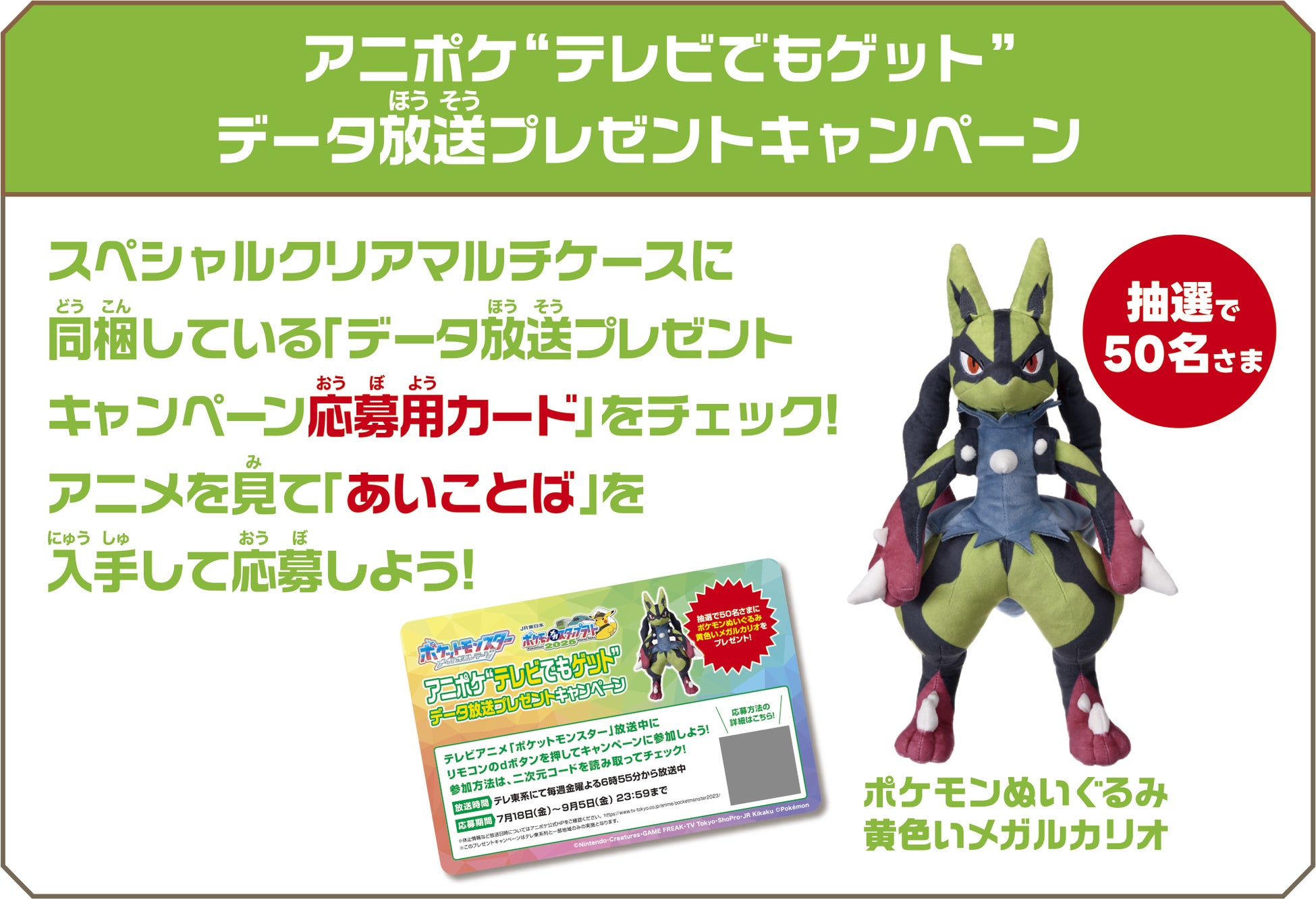 さらに、テレビアニメ「ポケットモンスター」と連携し、「ポケモンぬいぐるみ 黄色いメガルカリオ」が抽選で50名さまに当たる「アニポケ“テレビでもゲット”データ放送プレゼントキャンペーン」を実施します。詳しくは、「スペシャルクリアマルチケース」に同梱している「データ放送プレゼントキャンペーン応募用カード」をご確認ください。