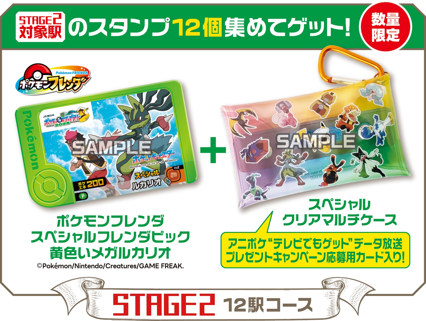 スタンプを集め、東京駅特設ゴールカウンターにスタンプ帳をお持ちいただくと、「ポケモンフレンダ スペシャルフレンダピック 黄色いメガルカリオ」と「スペシャルクリアマルチケース」をプレゼントします。