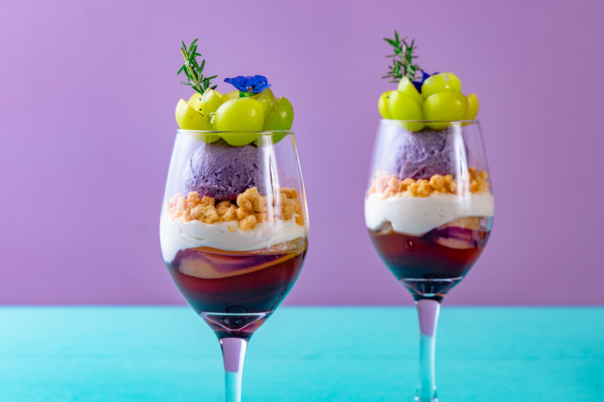 黄緑と紫の組み合わせが美しい印象的なシャインマスカットとブドウのパフェは贅沢にもおひとりさまお一つずつご提供。ブルーベリーカシスコンポートやホワイトチョコレートクリームなどのベースに、爽やかな甘さの葡萄のシャーベットとシャインマスカットをたっぷりのせ、最後にエディブルフラワーとローズマリーの香りでアクセントを加えることで、ここでしか味わえないオリジナリティ溢れるパフェに仕上げました。