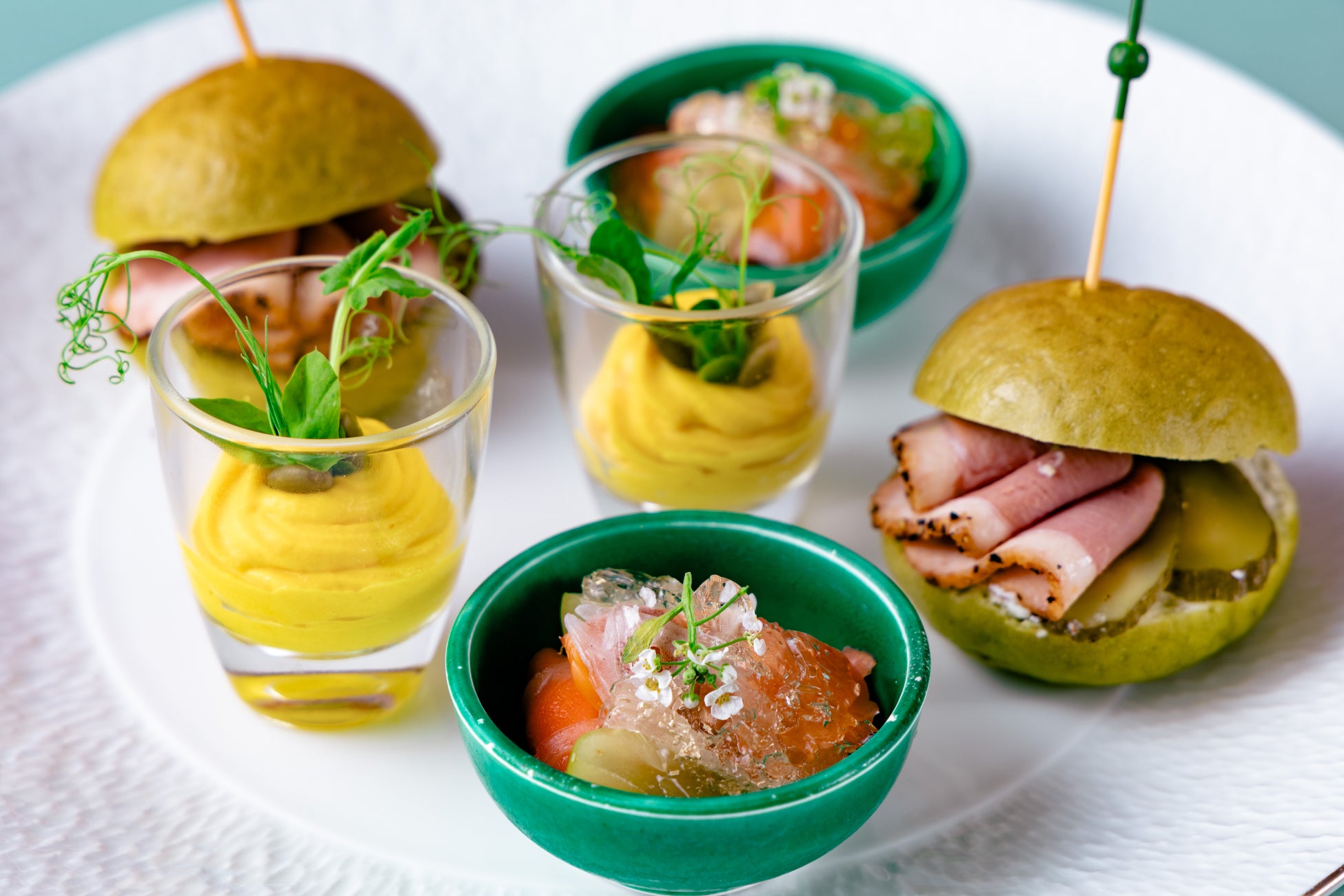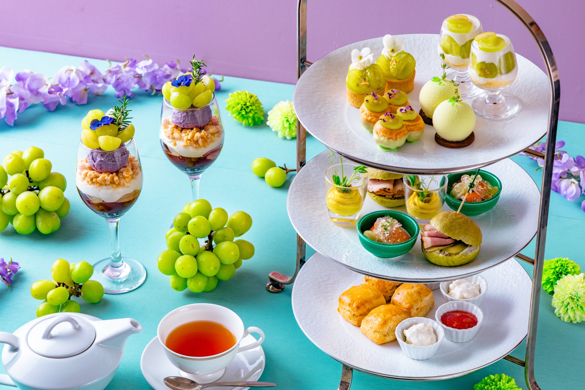アフタヌーンティーの3段スタンドを彩るのは、チーズタルトやエクレア、ショートケーキやムースといった定番スイーツと旬を迎えるシャインマスカットを組み合わせたスイーツ4種。シャインマスカットをたっぷりと使用しているのはもちろん、それぞれのスイーツと相性の良いフラワーやハーブを添えることで、この時期だけの特別な味わいに生まれ変わります。