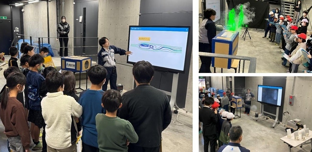 室内環境実験棟では、構造物と気流の関係について紹介しました。その後、スモーク入りの空気砲を使って、空気が渦を作りながら流れる様子を観察してもらいました。また、空気砲で狙う的の形状によって空気抵抗が異なることを説明しました。