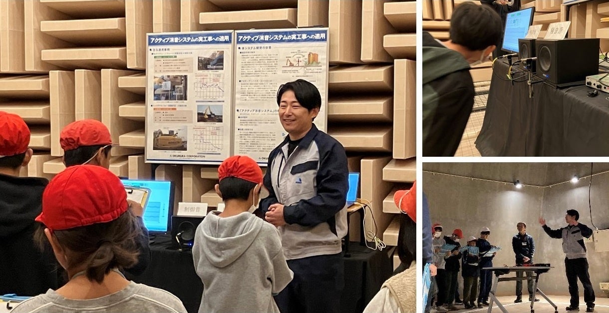 音響実験棟では、当社が開発した騒音対策技術「アクティブ消音システム」を体験してもらいました。この技術は、騒音を打ち消す音を発生させることで音を低減するものです。子どもたちは不思議そうに、場所を移動しながら音の聞こえ方の違いを確認していました。