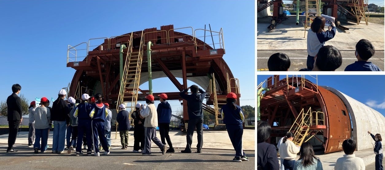 屋外実験ヤードでは、トンネルがどのように造られるのかを説明するとともに、なかなか見ることができない実物大のトンネルコンクリート用型枠などの施工機材を見学してもらいました。