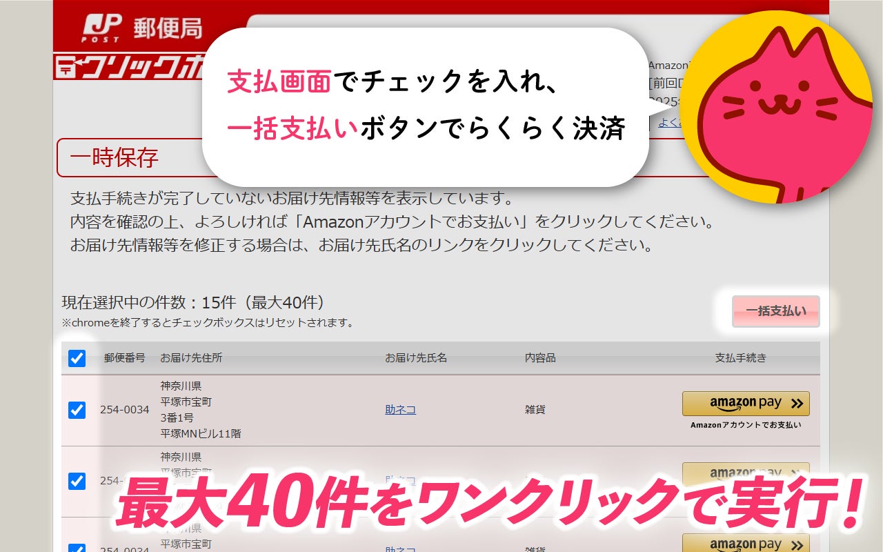 EC・フリマ発送作業の”地味な手間”を解消!助ネコ®、最大40件のクリックポスト支払い・利用控を一括処理できるChrome拡張機能公開