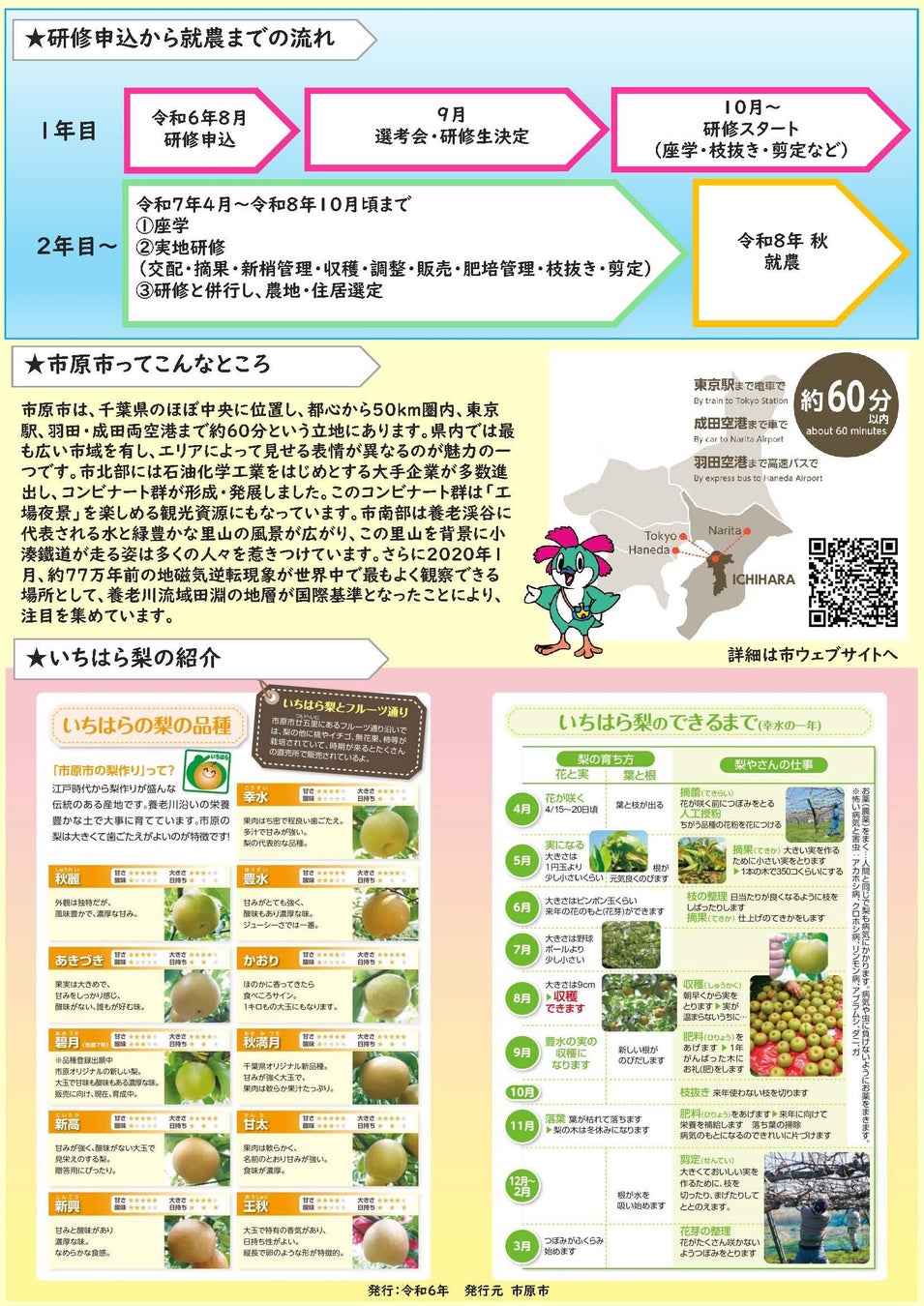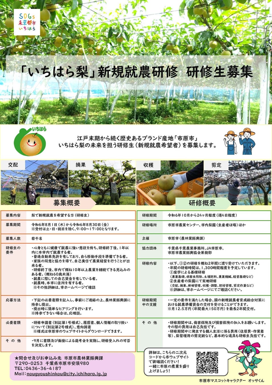 市原市の特産品である梨の担い手確保・育成のため、令和6年7月11日、市原市が新規就農者の研修機関として千葉県の認定を受けました。全国から研修生を募集し、市内の農業センターを拠点とした実地研修等を実施することで、梨作りの新たな戦力を育成し、今後も「いちはら梨ブランド」を全国の皆様に楽しんでいただけるよう、産地のパワーアップを図ります。