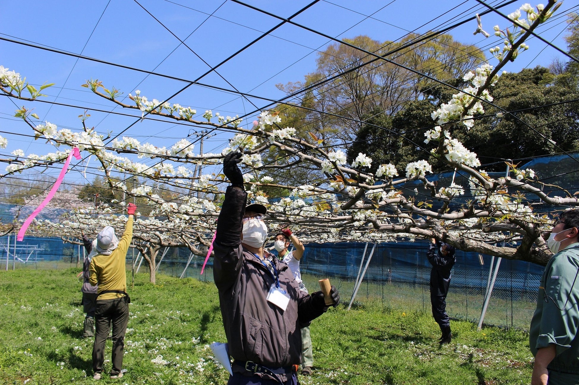 ② 梨園における実地研修(交配、摘果、収穫、販売、肥培管理、剪定作業など)