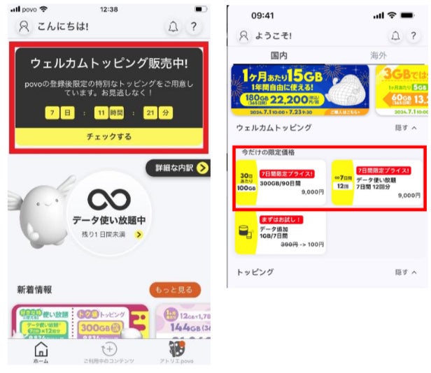 KDDI、沖縄セルラーは2024年7月12日から、povo2.0に新規加入後の7日間限定で通常よりおトクに利用できる「ウェルカムトッピング」において、「データ追加300GB(90日間)」と「データ使い放題(7日間)12回分」(注1)を、通常9,834円から834円割引の9,000円で提供します。