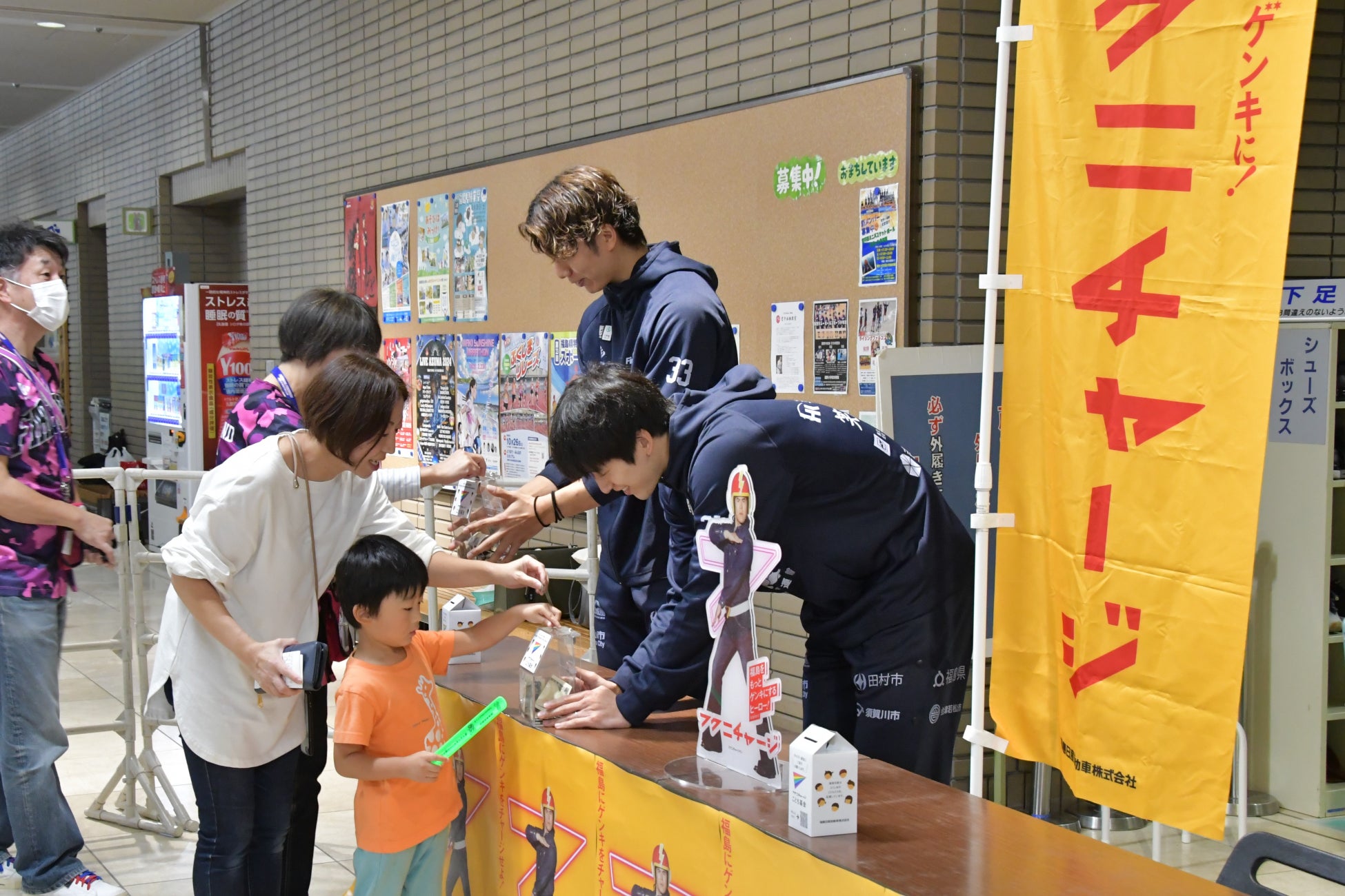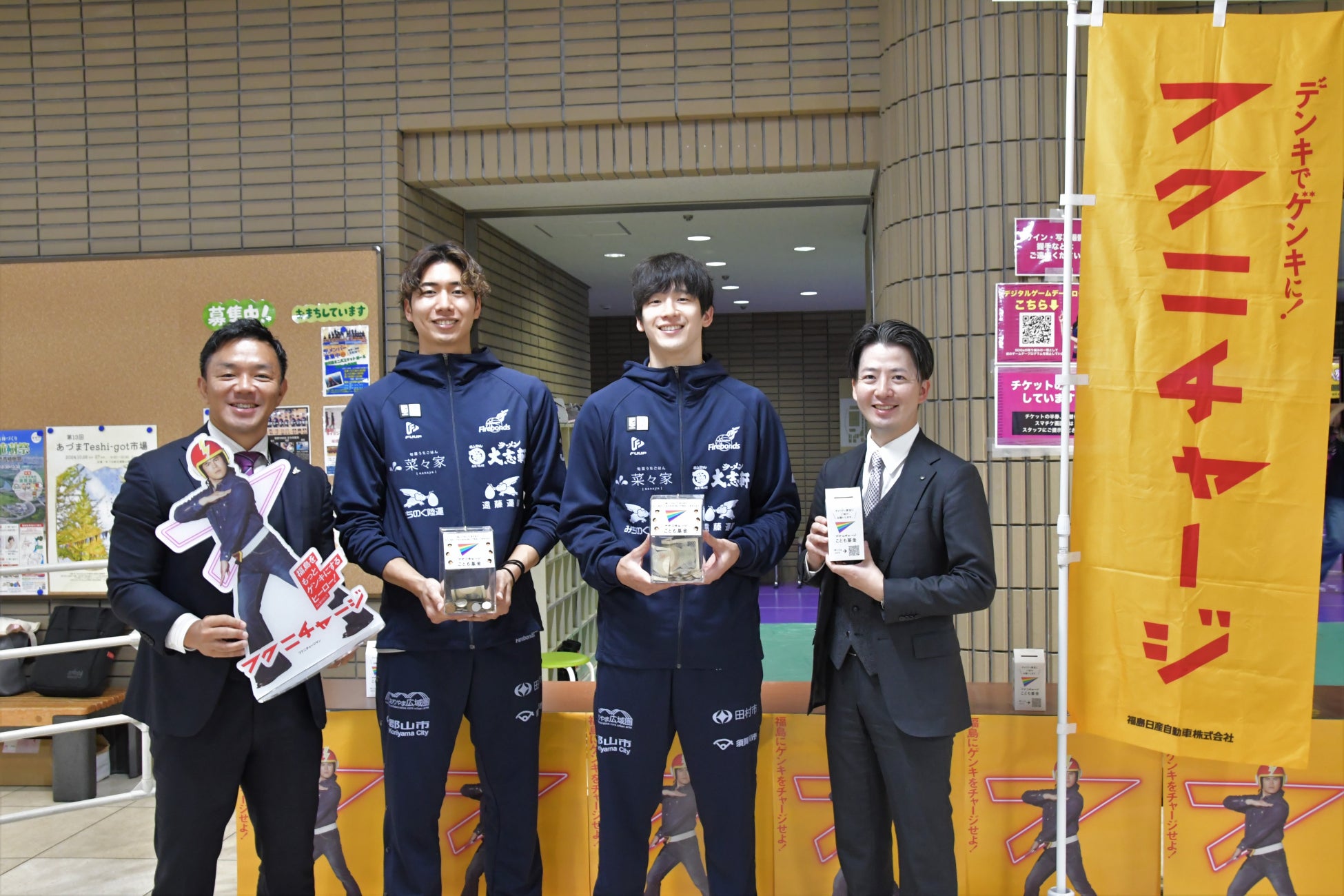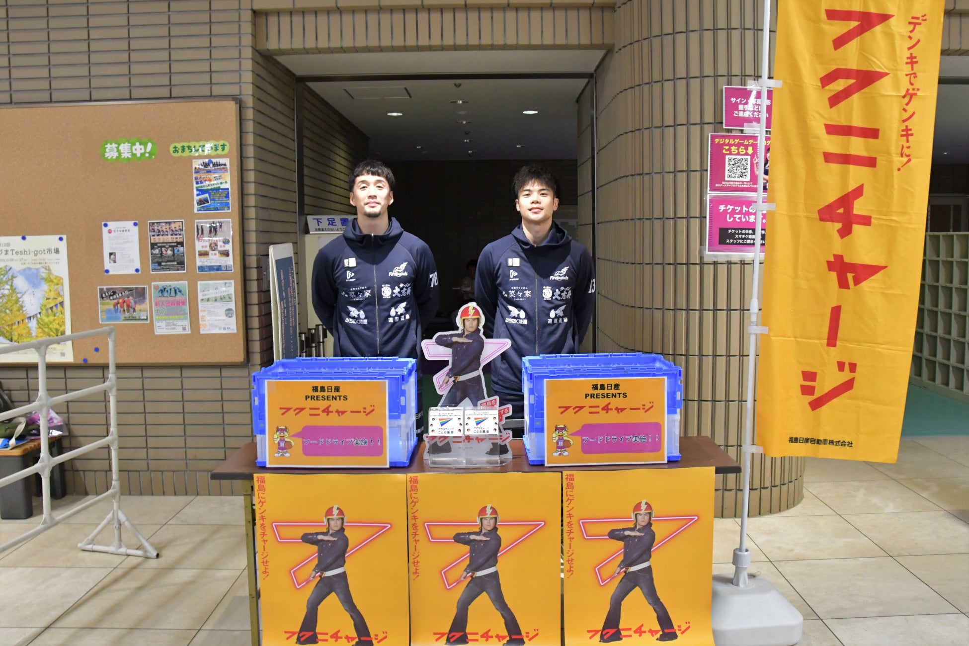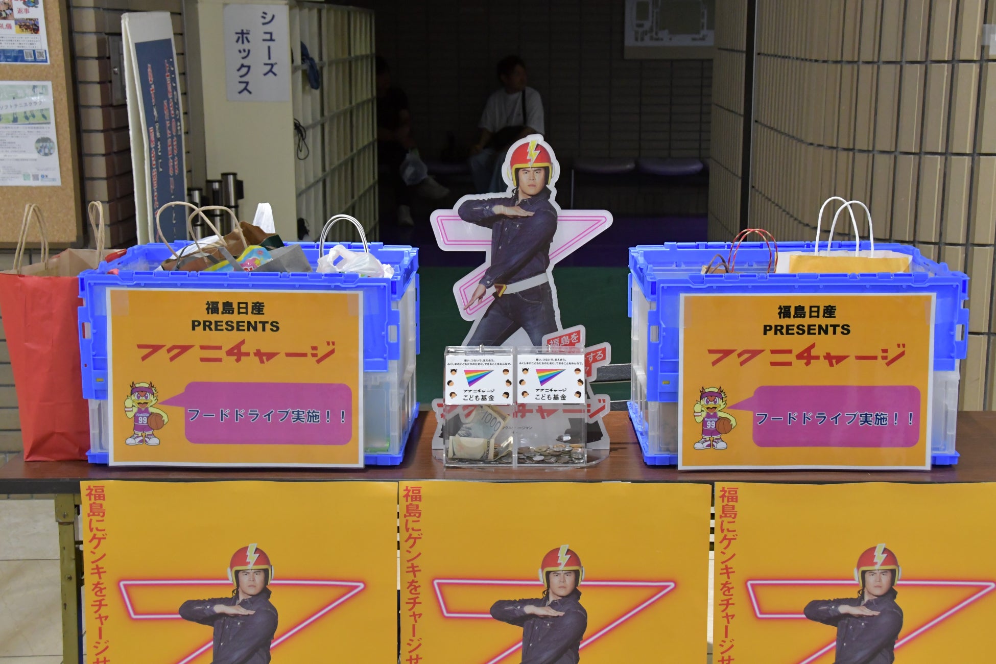 10月12日(土)、13日(日)にあづま総合体育館(福島県福島市)で開催された第2節HOME GAMEにおいて、12日のフクニチャージこども基金アクションには林翔太郎選手と菅野翔太選手に、13日のフードドライブアクションには田渡凌選手と笠井康平選手にご参加いただきました。ブースターの方々が持ち寄ってくださった募金や食品を大切にお預かりしました。集まった募金は福島の子どもたちの暮らしや教育環境整備のために、食品は地域の子ども食堂に加盟している団体へ、それぞれ寄付いたします。