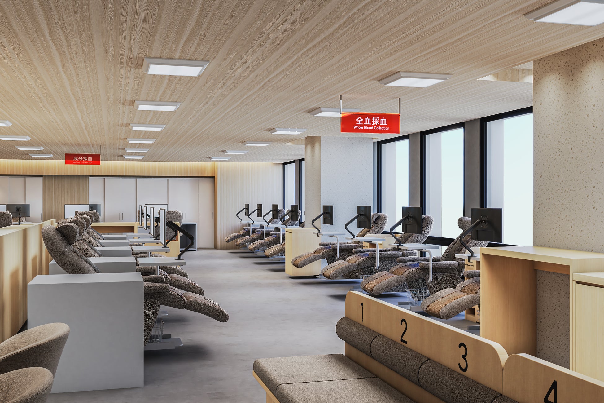 採血ベッドに向かう緊張や不安をやわらげ、心地よく過ごせる空間を演出しています。