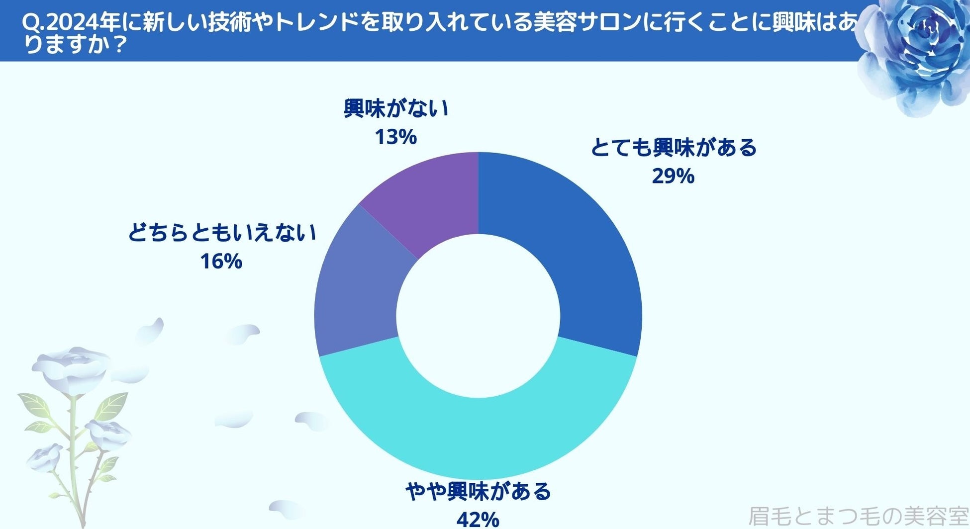 2024年に新しい技術やトレンドを取り入れている美容サロンに興味があるかお聞きしたところ「とても興味がある(29%)」、「やや興味がある(42%)」、「どちらともいえない(16%)」、「興味がない(13%)」という結果になりました。