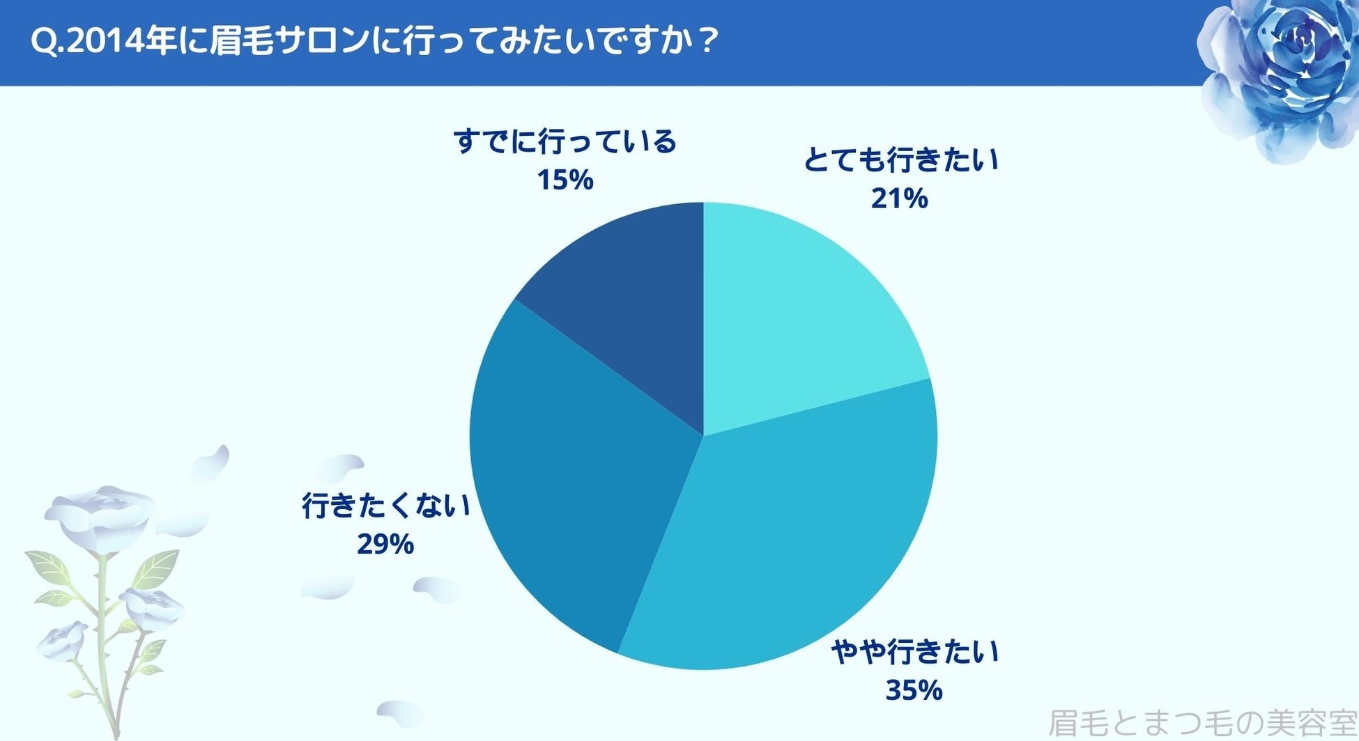 2014年に眉毛サロンに行ってみたいかお聞きしたところ「とても行きたい(21%)」、「やや行きたい(35%)」、「行きたくない(29%)」、「すでに行っている(15%)」という結果になりました。
