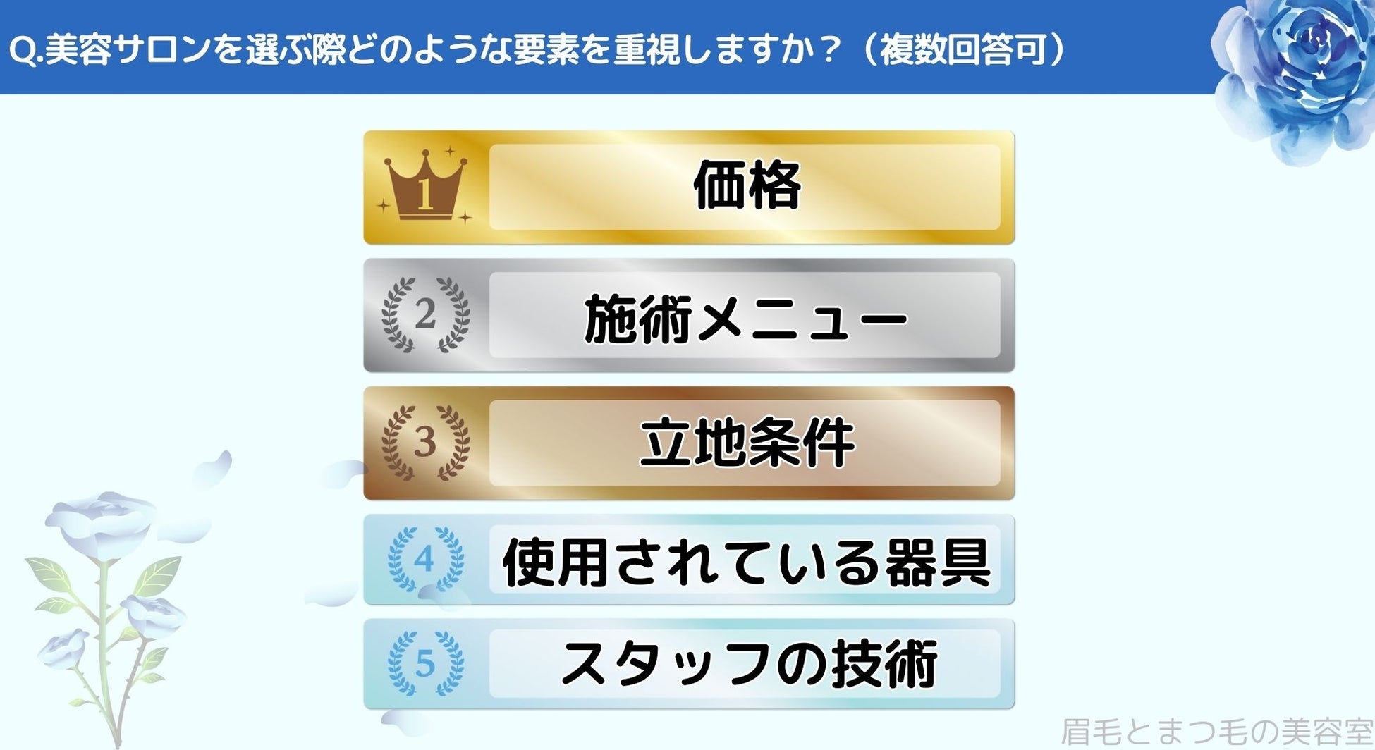 美容サロンを選ぶときに重視していることをお聞きしたところ「1位>価格」、「2位>施術メニュー」、「3位>立地条件」、「4位>使用されている器具」、「5位>スタッフの技術」という結果になりました。