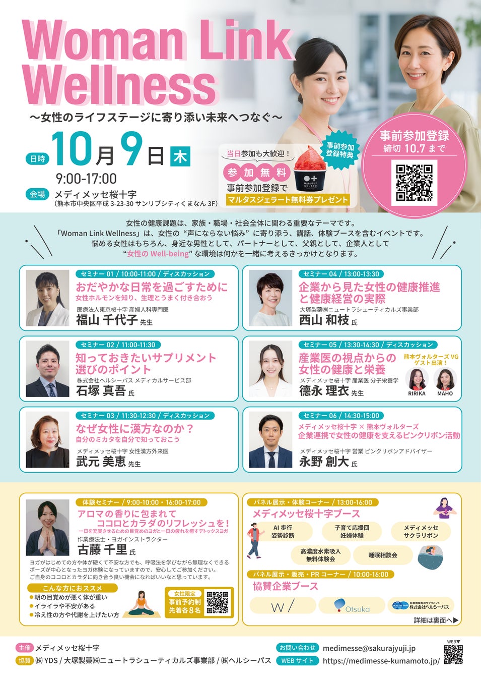 その一環として、メディメッセ桜十字予防医療センター(熊本市中央区)では、女性の健康を支援する「Woman Link Wellness」を2025年10月9日(木)9:00~17:00にて開催いたします。