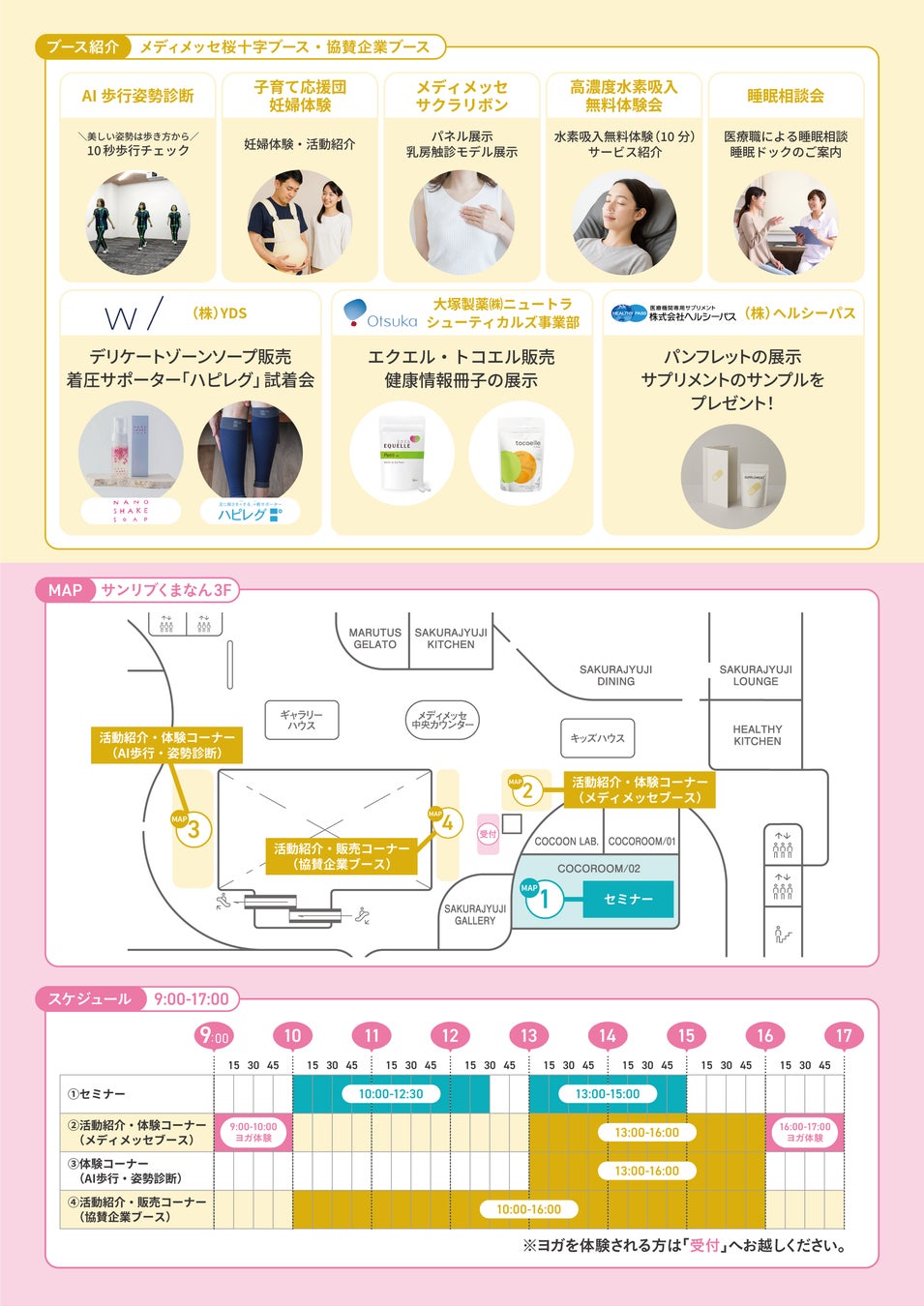 さらに協賛企業ブースでは、サプリメントのサンプル配布、デリケートゾーンケア製品や着圧サポーターの試着・販売、健康情報冊子の展示などを行い、来場者が楽しみながら学べる場を提供します。