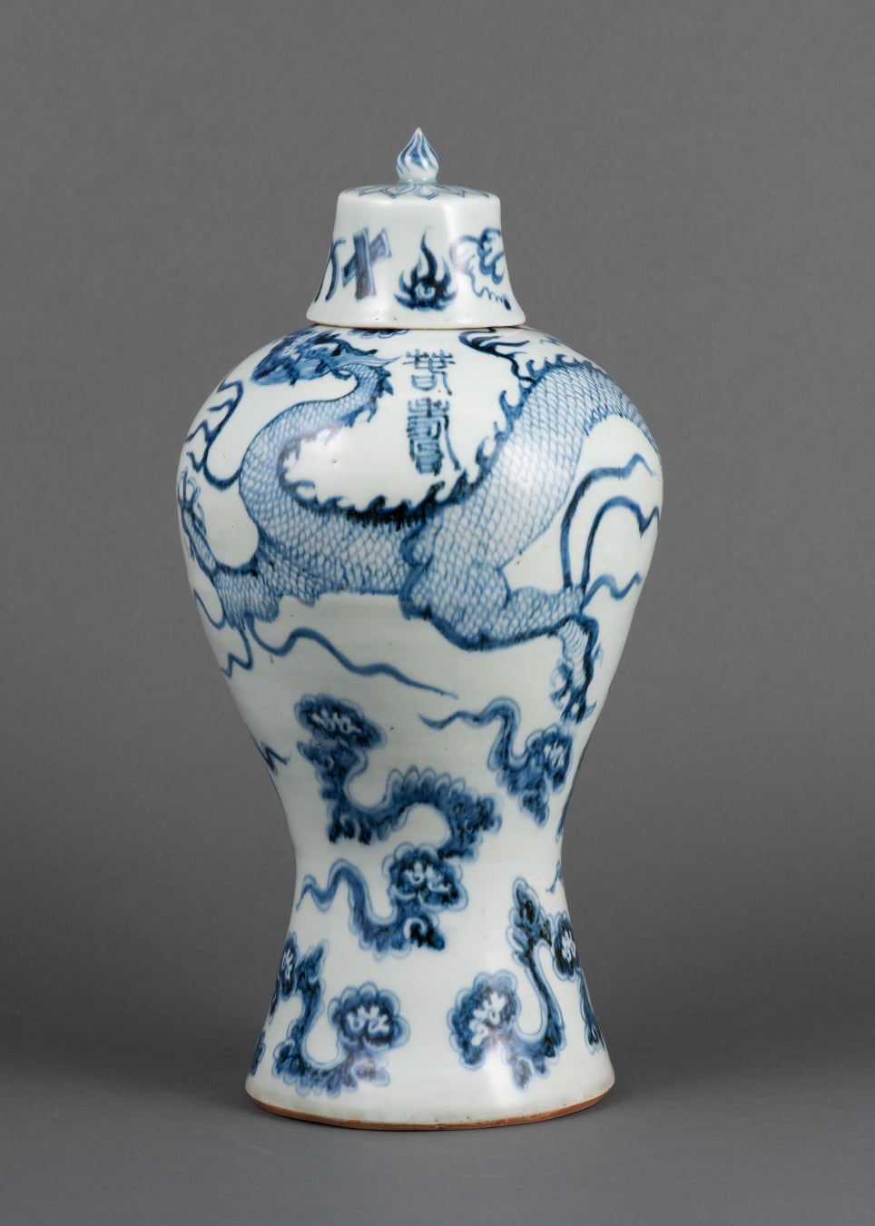 胴には五爪の龍と霊芝雲(れいしうん)が良質のコバルト顔料で描かれ、龍の上方には、篆書(てんしょ)体の「春壽(寿)」銘が見られる。五爪の龍は元時代以降、皇帝の象徴となり、本作は明時代・洪武朝の宮廷用磁器である。