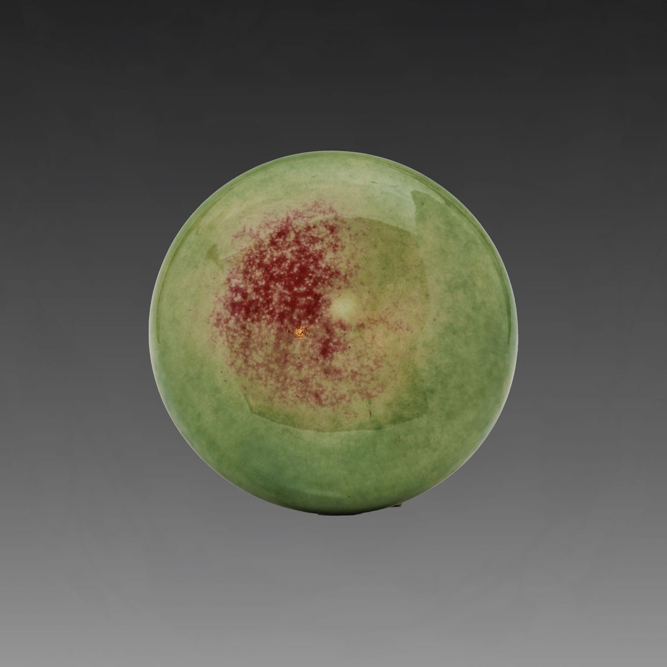 豇豆紅釉が窯の中での窯変(ようへん)により、「蘋果緑(ひんかりょく)(青りんごの緑)」と呼ばれる淡い緑色に変じた奇跡の一点。蘋果緑は「値千金」ともいわれている。
