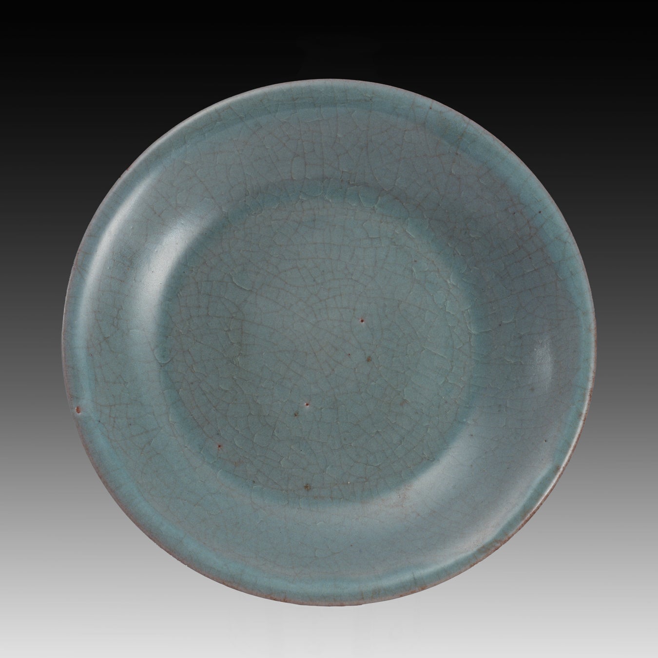 北宋時代の宮廷用青磁を生産した汝窯の伝世品は世界で90件余り。上海博物館は9件を所蔵しており、今回2件が出品される。本作は口が大きく開いた浅い盤で、「天青(てんせい)」色の釉には細かな貫入が生じている。