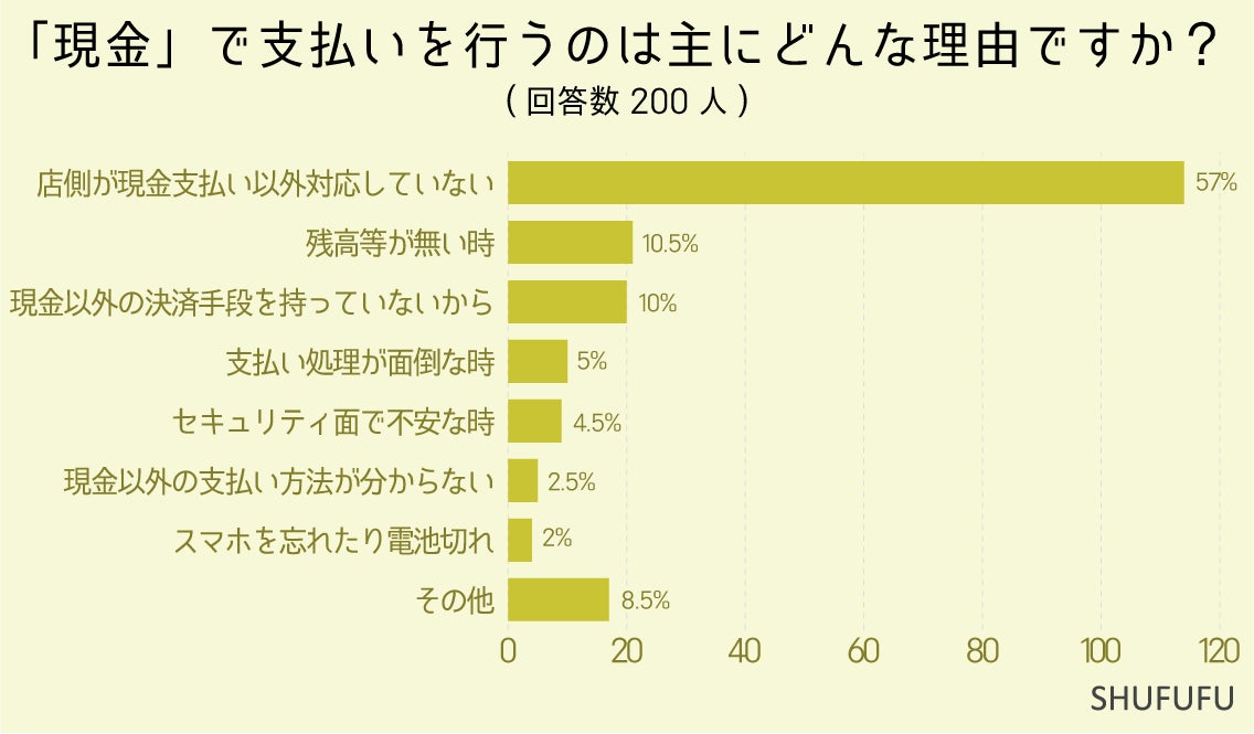 「現金」で支払いを行う主な理由に関しては1位「店側が現金支払い以外対応していない(57%)」、2位「残高等が無い時(10.5%)」でした。現金を使うのは現金以外のキャッシュレス決済方法がないからという理由が1位ですね。積極的な理由というより消極的な理由からのようで、現金以外の支払いを望む人の存在が多いように見られます。