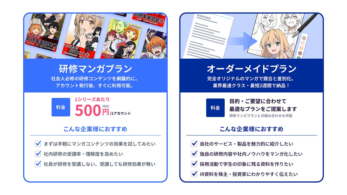 当社は2024年8月より「LearningToon」の提供を開始し、これまで口コミやリピート注文を中心に、多くの企業さまにご利用いただいてまいりました。特に、「研修資料を読んでもらえない」「サービスの背景や想いが伝わらない」といった課題を抱える企業から高い評価を得ており、マンガという手法の有効性を実感する声を多数いただいております。